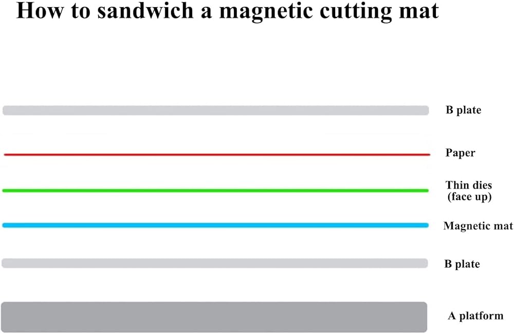 • Recipe for die cutting of thin metal dies: 'A' Plate + 'B' Plate + Magnetic Cutting Mat + 'B' Plate ( with die and paper on the magnetic cutting mat)