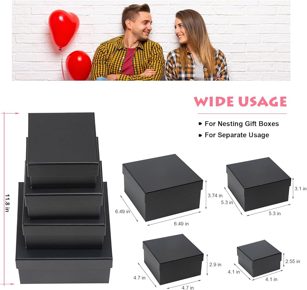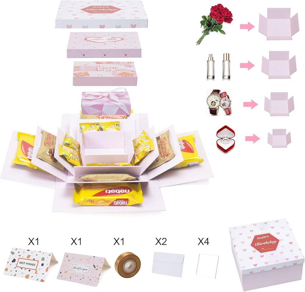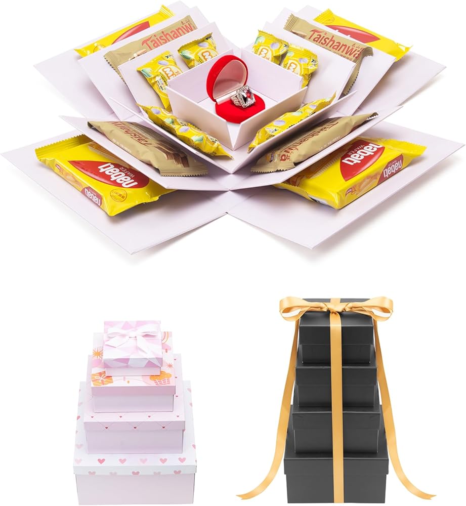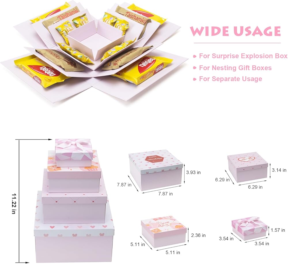【تحتوي العبوة على: يوجد 8 صناديق إجمالاً. سوف تحصل على 4 صناديق هدايا متداخلة بأحجام مختلفة مع شريط و4 صناديق هدايا متفجرة.