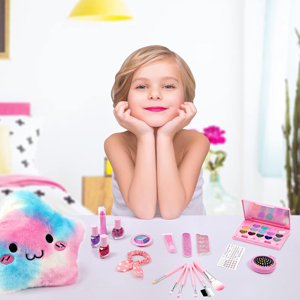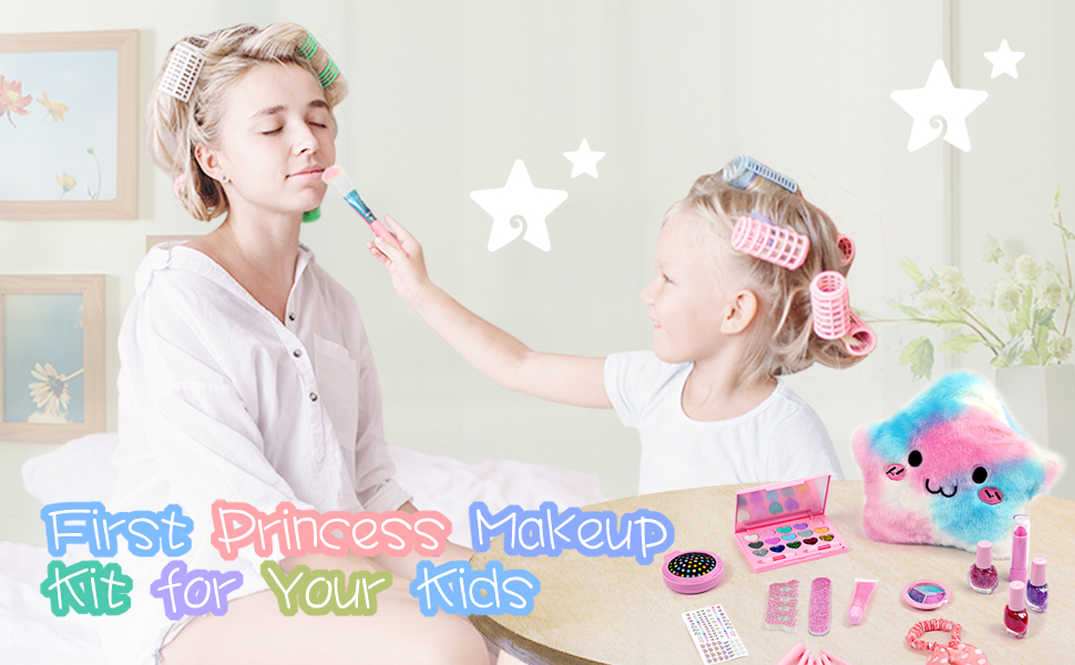 • مجموعة مكياج الأطفال للفتيات: الأميرة الصغيرة في حياتك ستسعد بمجموعة المكياج الكاملة هذه. تشتمل المجموعة على محفظة مستحضرات التجميل*1، مجموعة ظلال العيون*1، ثلاثي أحمر الخدود*1، أحمر الشفاه*1، ملمع الشفاه*1، طلاء الأظافر*3، فرشاة ظلال العيون*1، مشط قابل للطي*1، مبرد أظافر*1، فاصل لأصابع القدم* 1، فرش مكياج*5، ملصقات*1