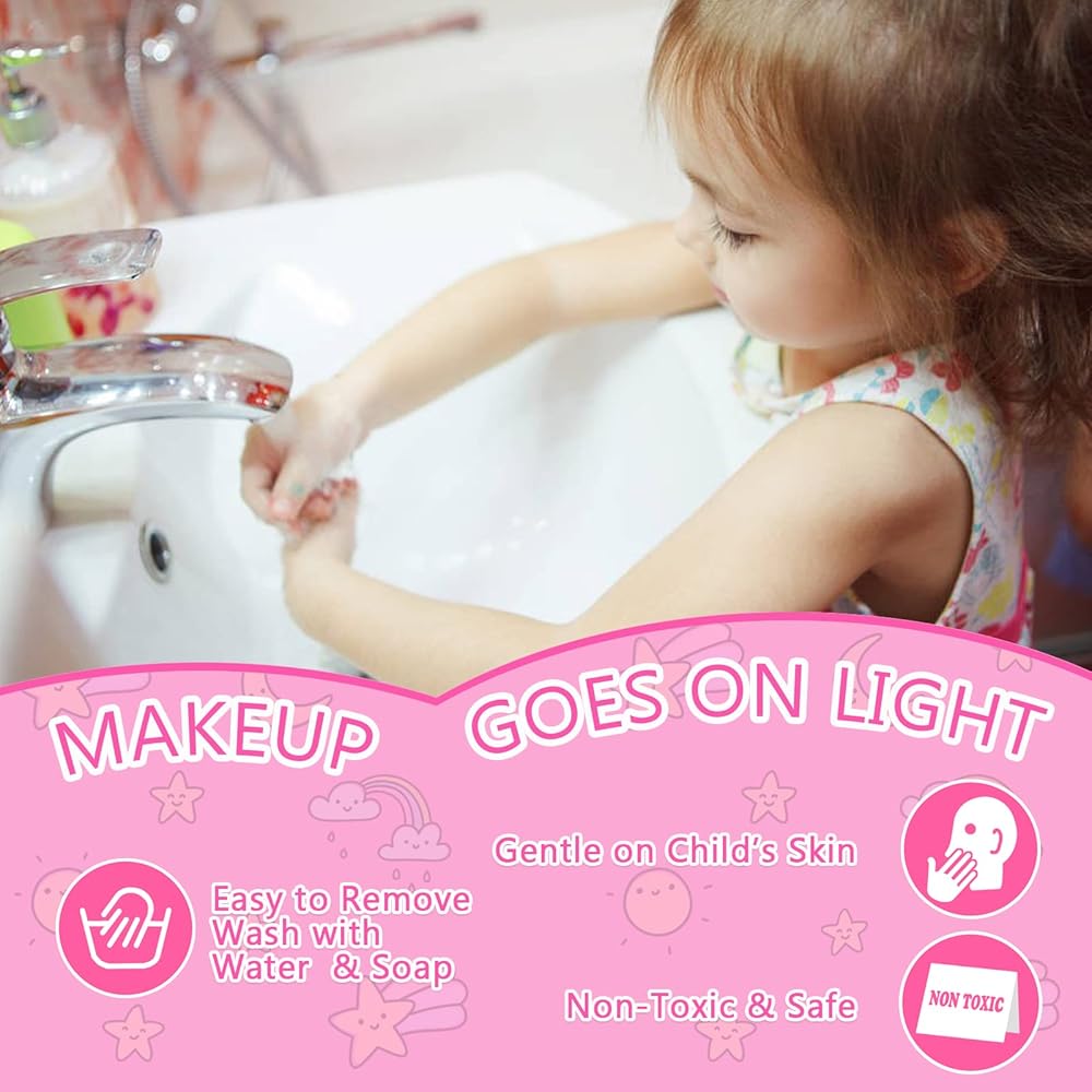 • قابل للغسل ويضيء: يمكن مطابقة كل لون بسهولة مع مكياج جميل ولكن ليس ناضجًا. لعبة مكياج الأطفال الصغار مصنوعة من مواد آمنة قابلة للذوبان في الماء ويمكن غسلها بالماء والصابون. ليست هناك حاجة لمكياج خاص أو مزيل طلاء الأظافر. وبدون خوف من بقع السجاد أو علامات الأثاث، يمكنك السماح لها باللعب كما تريد