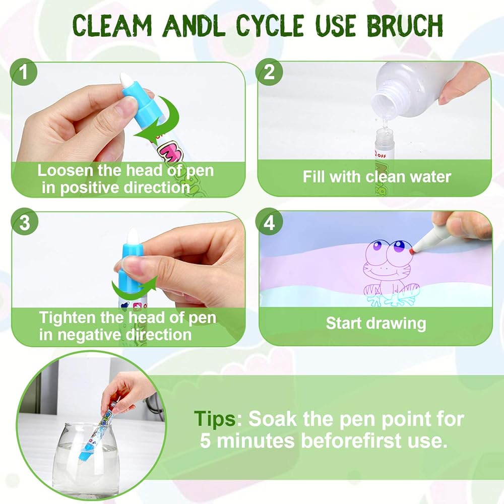 قابلة لإعادة الاستخدام دون اتساخ في أي مكان: من السهل الطلاء باستخدام قلم سحري مملوء بالماء النظيف، ستختفي الرسومات بطريقة سحرية في غضون 5-10 دقائق جاهزة للرسم مرة أخرى! يمكنك الاسترخاء بسهولة دون القلق من اتساخ طفلك في المنزل أو نفسه.