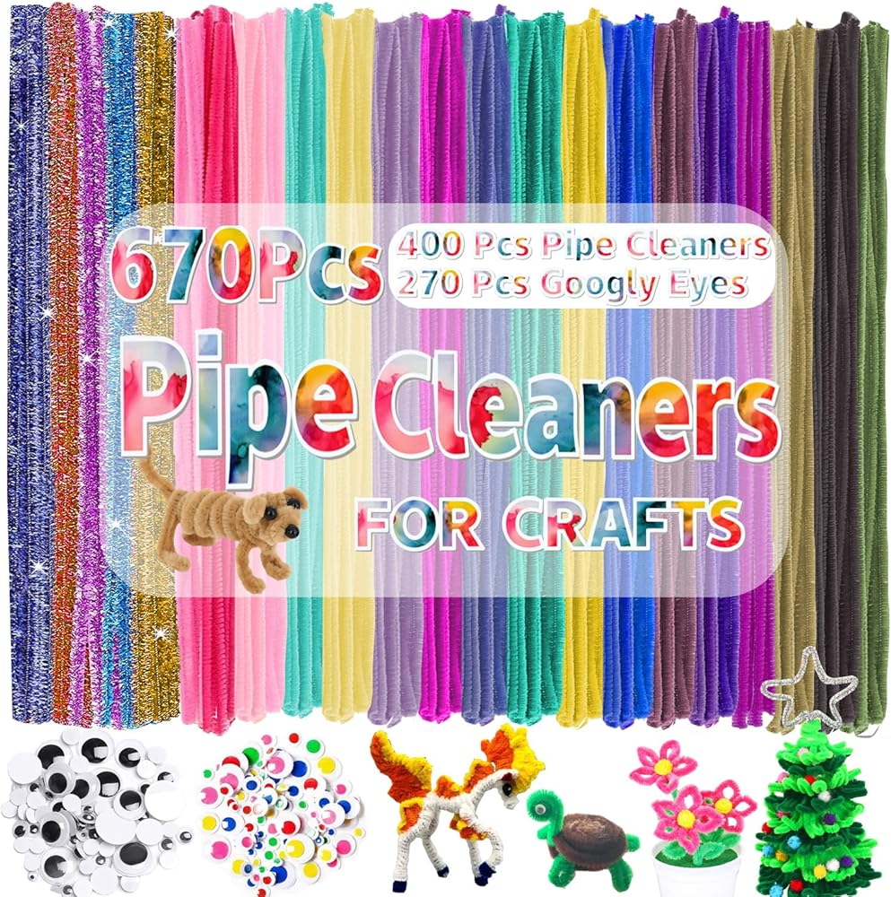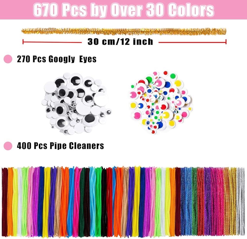 ✅ عبوة اقتصادية أكبر: تأتي منظفات الأنابيب في عبوة كرتونية، بإجمالي 670 قطعة، تحتوي على 300 قطعة من منظفات الأنابيب متعددة الألوان و100 قطعة من منظفات الأنابيب اللامعة متعددة الألوان، و135 قطعة من عيون جوجل ذاتية اللصق السوداء و135 قطعة من عيون جوجل ذاتية اللصق الملونة. مقاسات منظفات الأنابيب 12 انش × 6 ملم.