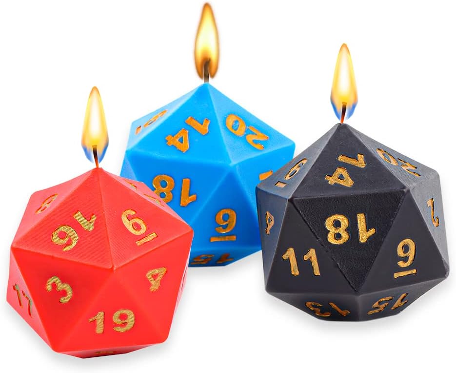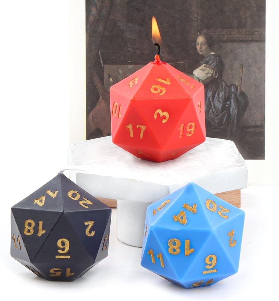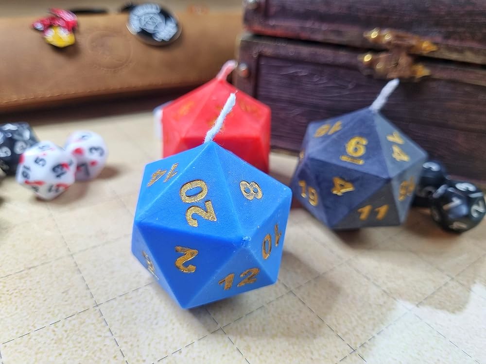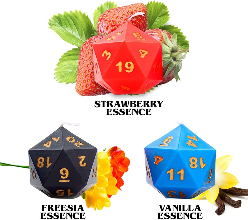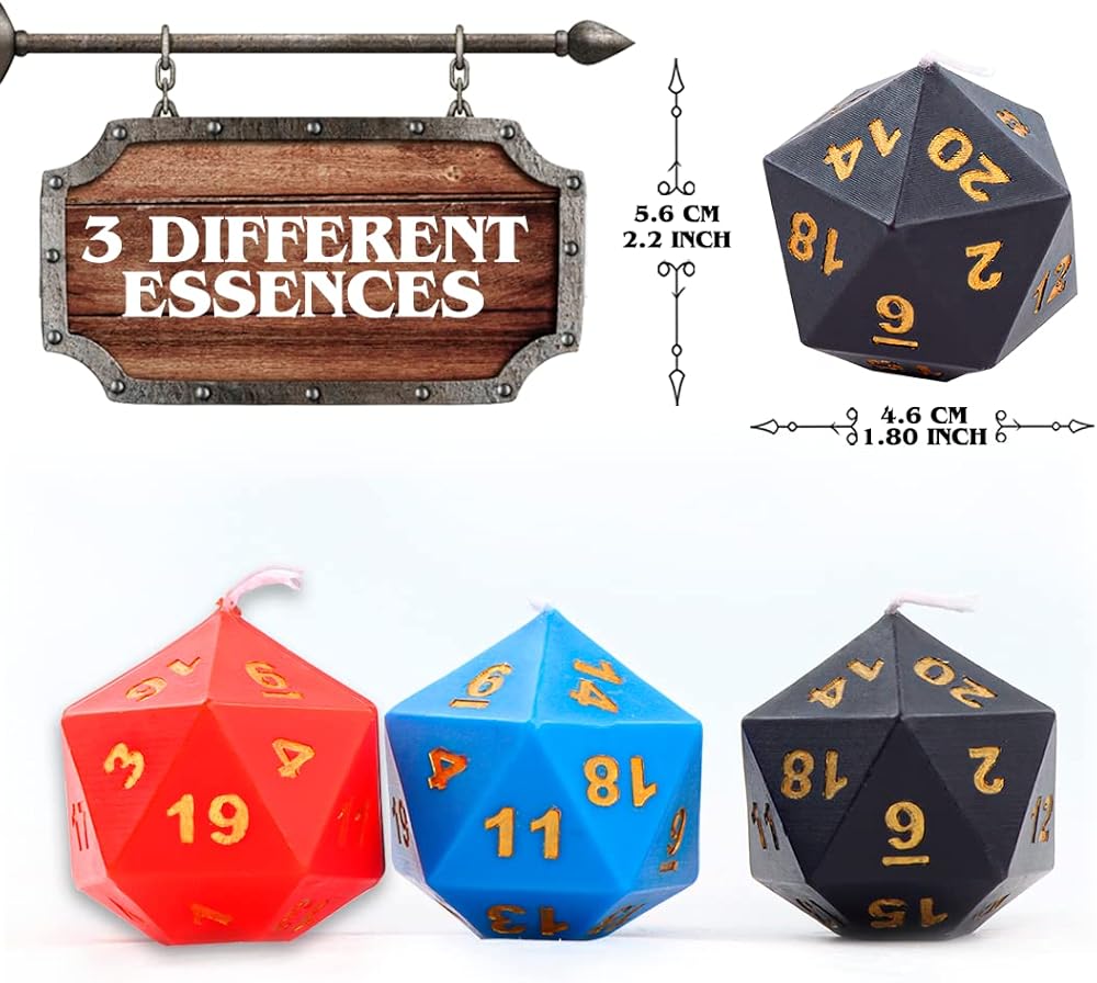 • 🐉 شموع على شكل نرد باور بيست دونجيون D20: مجموعة من 3 شموع مصنوعة يدويًا على شكل نرد D20، كل واحدة لها جوهر مختلف. النرد الأحمر: جوهر الفراولة. قالب أزرق اللون: جوهر الفانيليا. النرد الأسود: جوهر فريزيا.