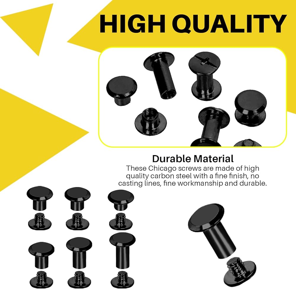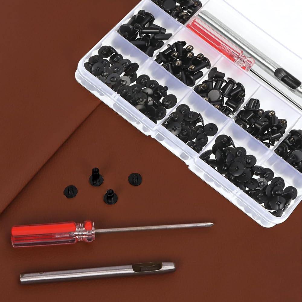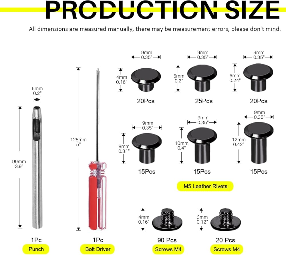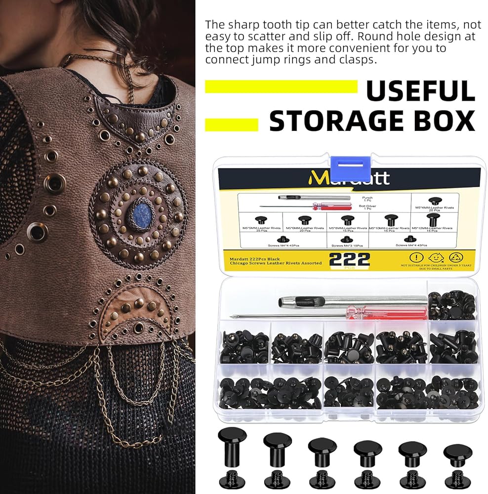 Mardatt 222 قطعة 6 أحجام براغي شيكاغو مجموعة متنوعة مع أدوات الإعداد، M5 X 4/5/6/8/10/12 مم مسامير جلدية M5 شيكاغو مسامير ربط مسامير ربط أعمدة مسمار لإصلاح الحرف الجلدية DIY (أسود)