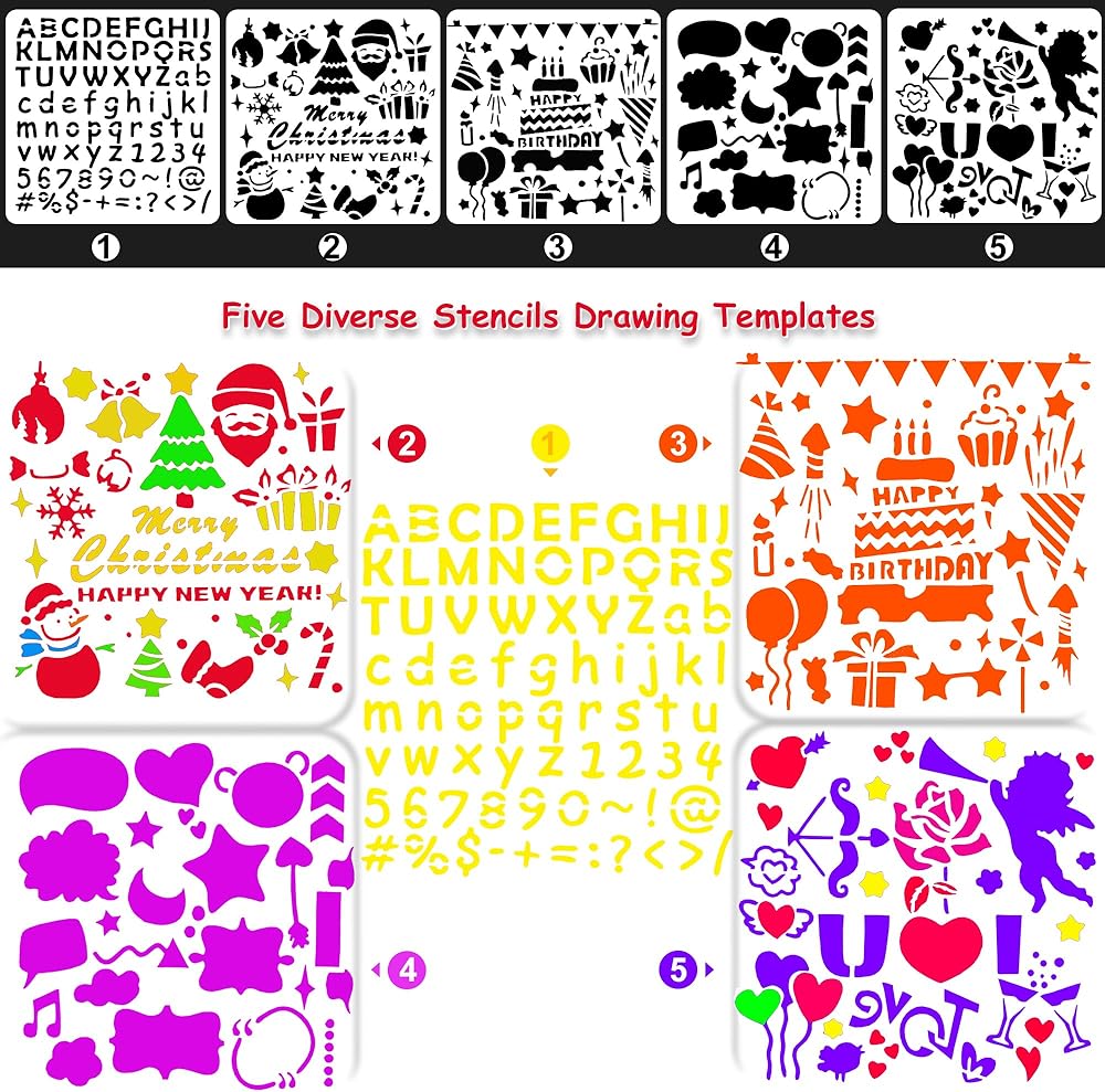 حقيبة بسحاب محمولة: هذه الأقلام الموجودة في علبة متينة، مثالية للإبداع أثناء التنقل. تضمن الحالة المنظمة أن تكون أقلام التحديد النابضة بالحياة التي لا تنزف في متناول يدك دائمًا. تحتوي هذه المجموعة أيضًا على 5 قوالب رسم استنسل إضافية. عزز مجموعة أدواتك الإبداعية بخمسة قوالب رسم استنسل متنوعة. تفتح هذه القوالب إمكانيات جديدة للتصميمات والأنماط والتفاصيل المعقدة في عملك الفني.