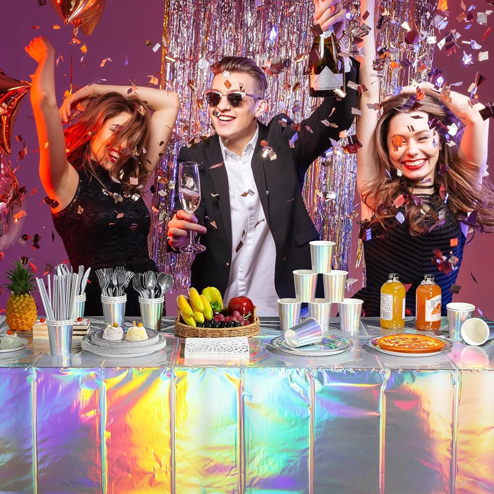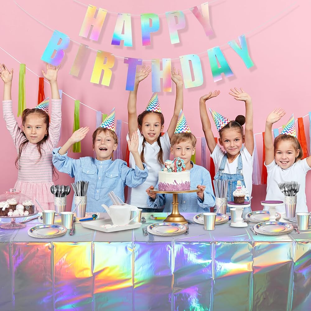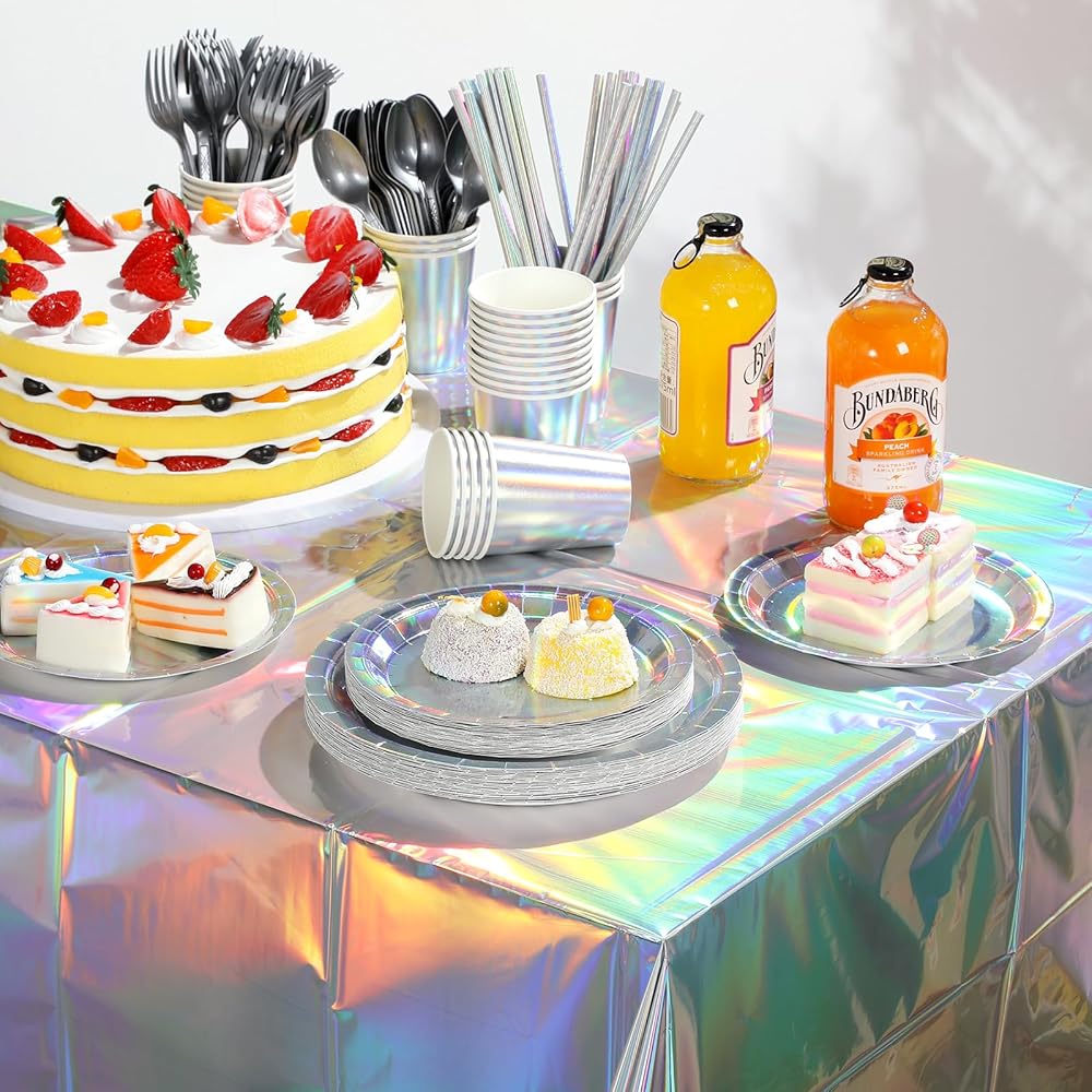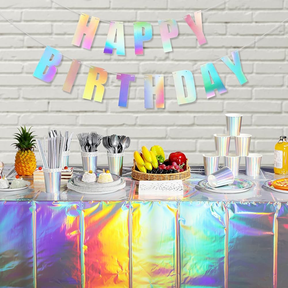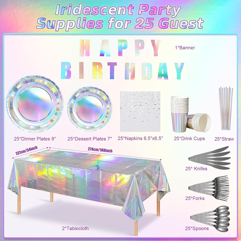 Package Includes: The iridescent birthday dinnerware set comes with 1 "Happy Birthday" iridescent banner, 2 iridescent tablecloths, 25 paper dessert plates (7 inches), 25 paper dinner plates (9 inches), 25 cups (9oz), 25 napkins (6.5 x6.5 inches), and 25 sets of knives, forks, spoons, and straws, making it perfect for serving up to 25 guests.