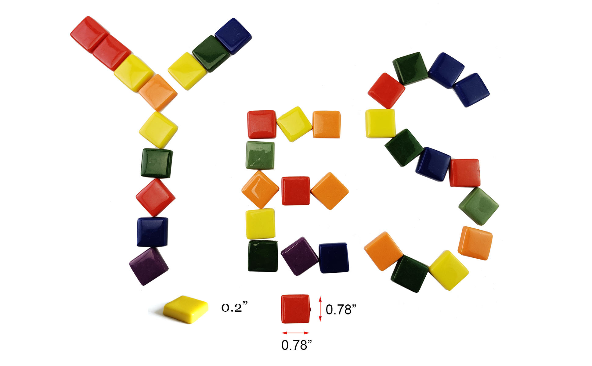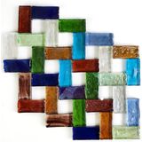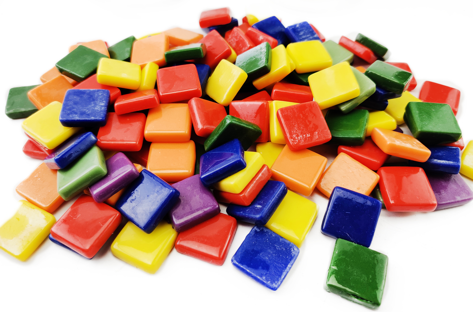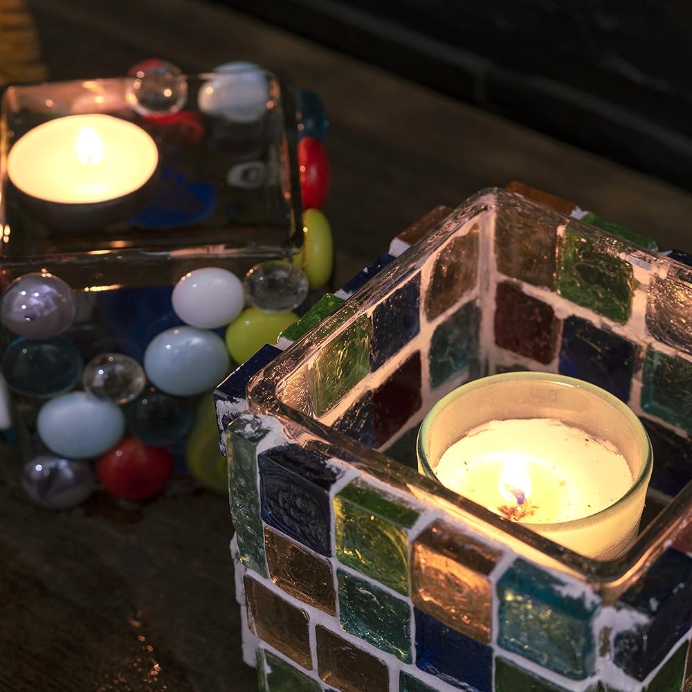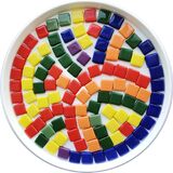 العبوة: مجموعات حرفية زجاجية فسيفساء مربعة مزيج من 6-7 ألوان: الأزرق الداكن والبرتقالي والأصفر والأحمر الجزري والأرجواني والأخضر الداكن والفاتح. حوالي 120 قطعة معبأة في وعاء بلاستيكي.