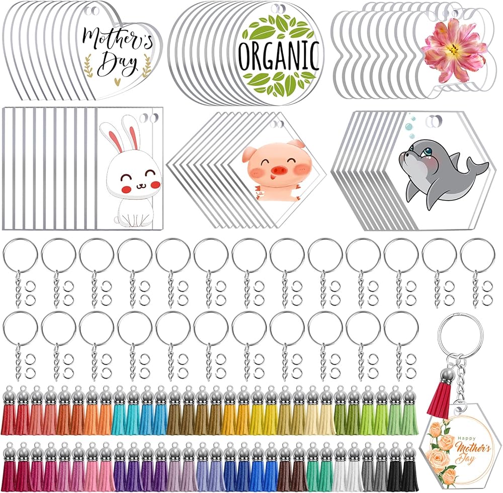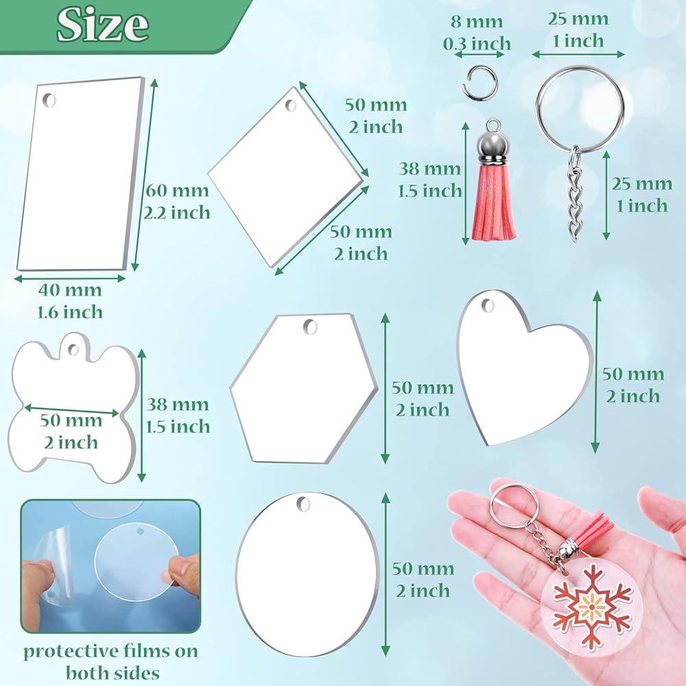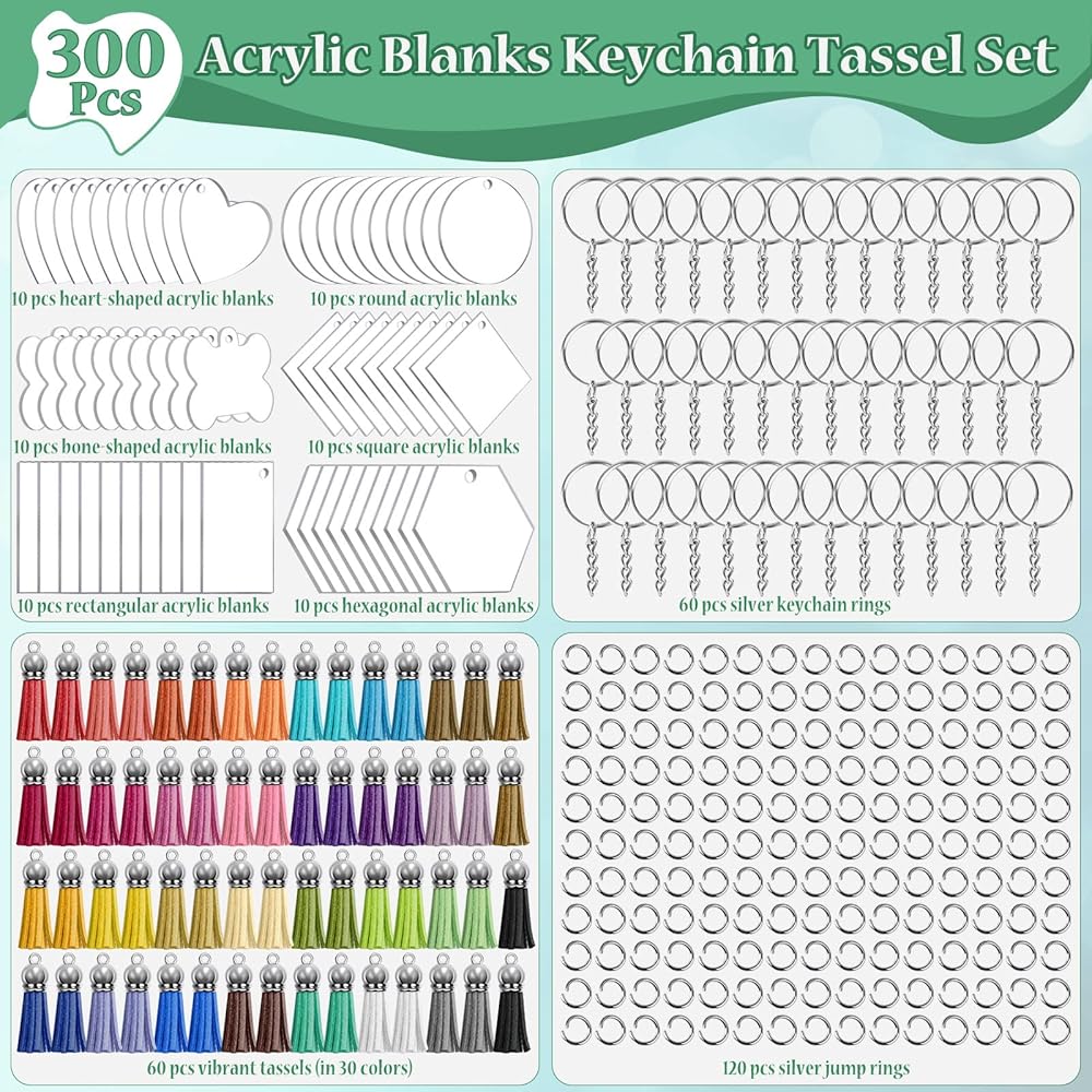 300 قطعة من سلاسل المفاتيح الفارغة الاكريليك مع شرابات وحلقات مفاتيح