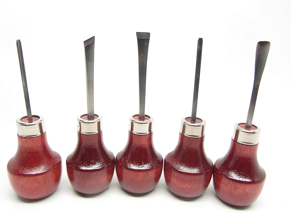 نسخة أصغر من مجموعة 107. للعمل البسيط أو التفصيلي. مصنوعة من فولاذ الأدوات عالي الجودة، مصقول ومصقول للحصول على لمسة نهائية حادة وجاهزة للاستخدام. الطول الإجمالي 5-1/2 بوصة، طول الشفرة 1-3/4 بوصة. تتضمن المجموعات 5 قطع: 1/4 بوصة، 1/8 بوصة، 1/8 بوصة فراق منحني، 1/4 بوصة انحراف، 1/ 4" إزميل منحني.