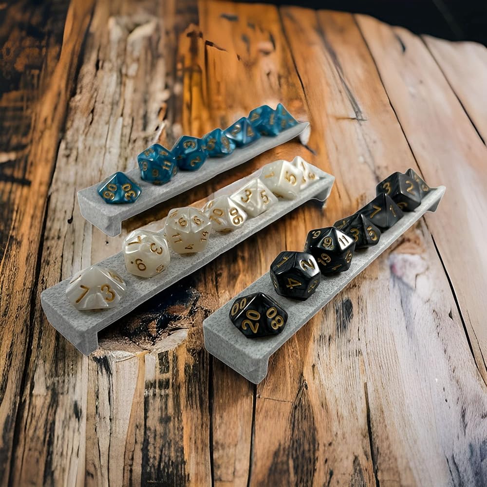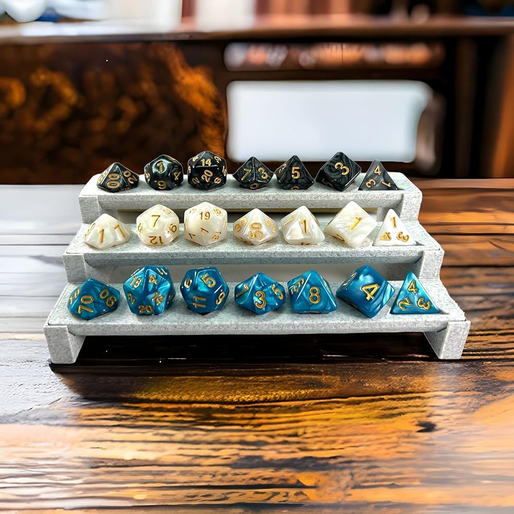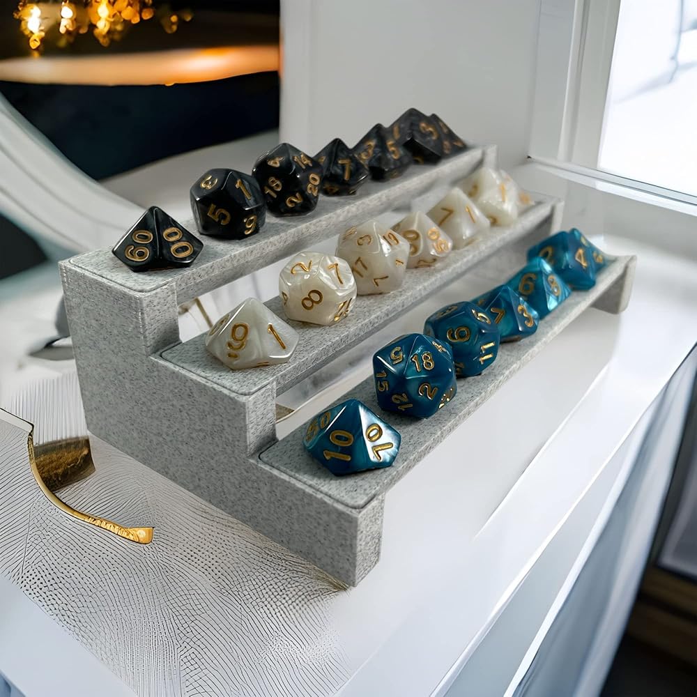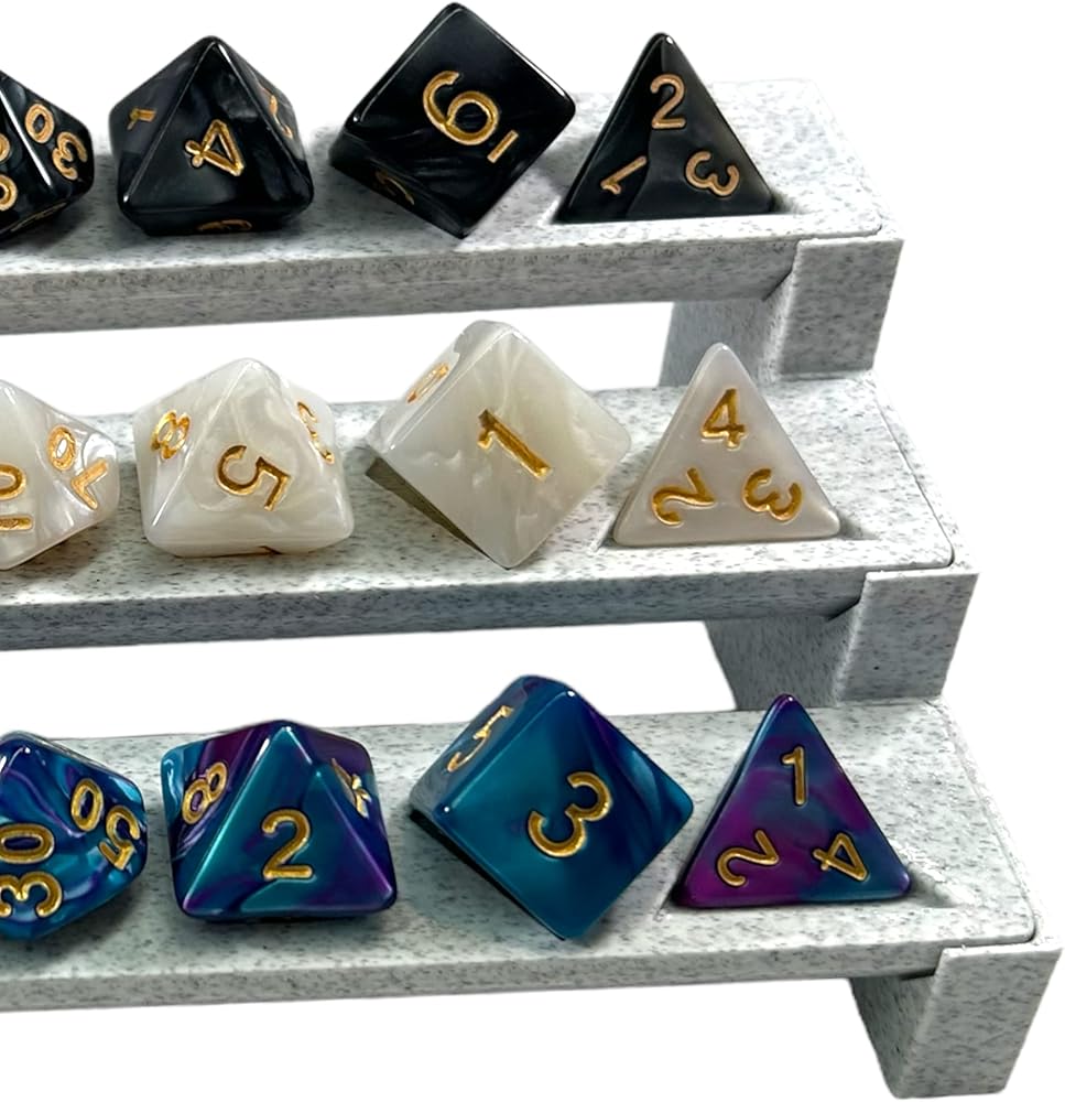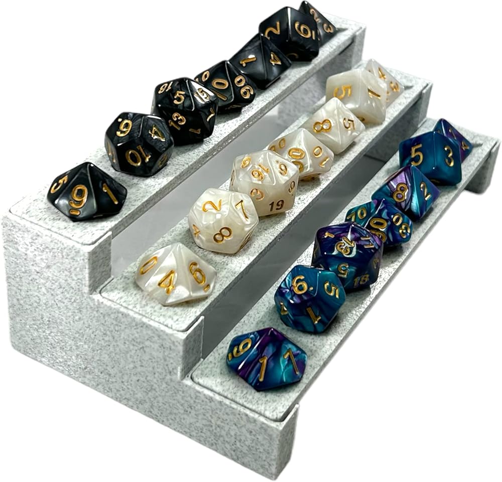 • Perfect for Dungeons & Dragons dungeon masters, Show off your favorite dice collections in style.Fits Most Standard Sized D4-D20 dice holds 3 complete sets of 7 polyhedral dice, 21 dice total.Lightweight Marble Stone Composite Material wont damage any surfaces like glass tables or desks.Ultimate DND Accessories - collector gift for your prized good dice, Show them off like they deserve.Minimalist and Sleek D N D Polyhedral design - Dice Decor to fit into any RPG gaming setup.