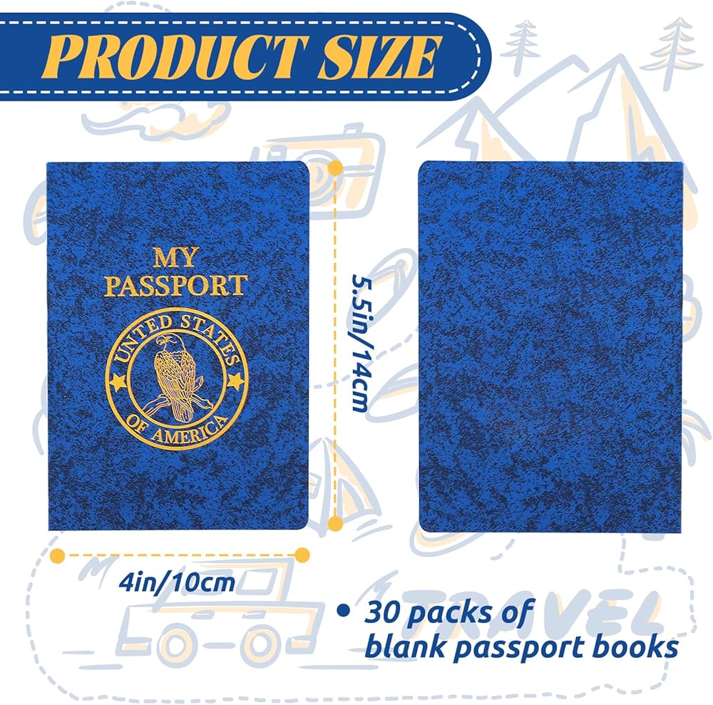 Zddaoole 30 حزمة دفتر جواز سفر فارغ، دفتر جواز سفر بالجملة، جواز سفر مزيف أزرق للأطفال التظاهر باللعب، كتاب ملصقات جواز السفر للسفر العالمي اللوازم المدرسية ديكور الحفلات