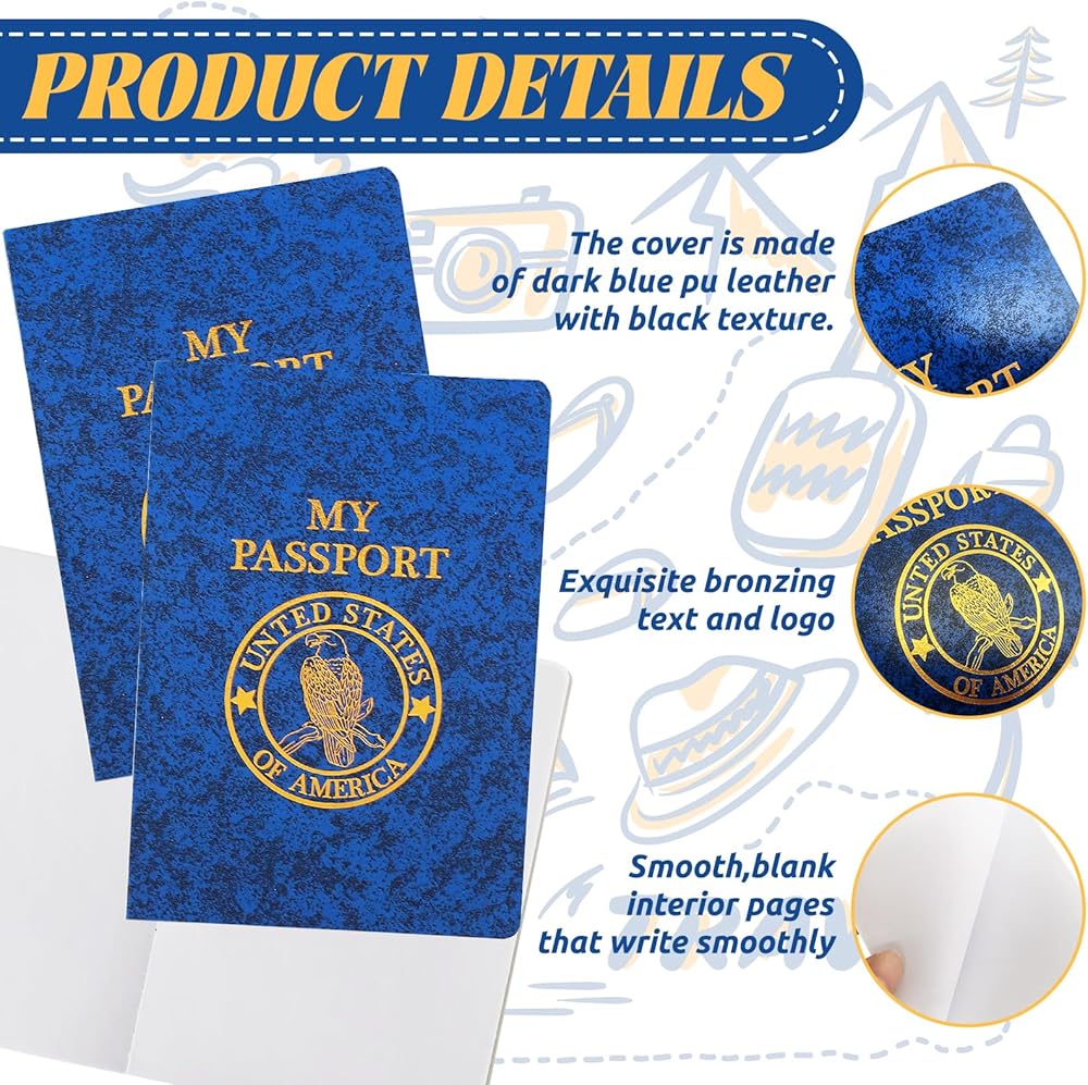 تُعد كتب جواز السفر المزيفة الزرقاء الخاصة بنا رائعة لحفلات ألعاب الأطفال، وجوائز الأنشطة الصفية، واللعب التظاهري، وهدايا أعياد ميلاد الأطفال، والكرنفالات وغيرها من هدايا العطلات.