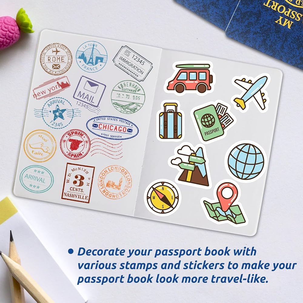 • اصنع كتب جواز السفر الخاصة بك: نظرًا لأن الصفحات الداخلية عبارة عن ورق أبيض فارغ تمامًا، يمكنك تخصيص النص والوحدات، ويمكنك الكتابة والرسم والختم ولصق الملصقات، وما إلى ذلك. سيحب الأطفال كتاب ملصقات جواز السفر هذا للمدرسة.