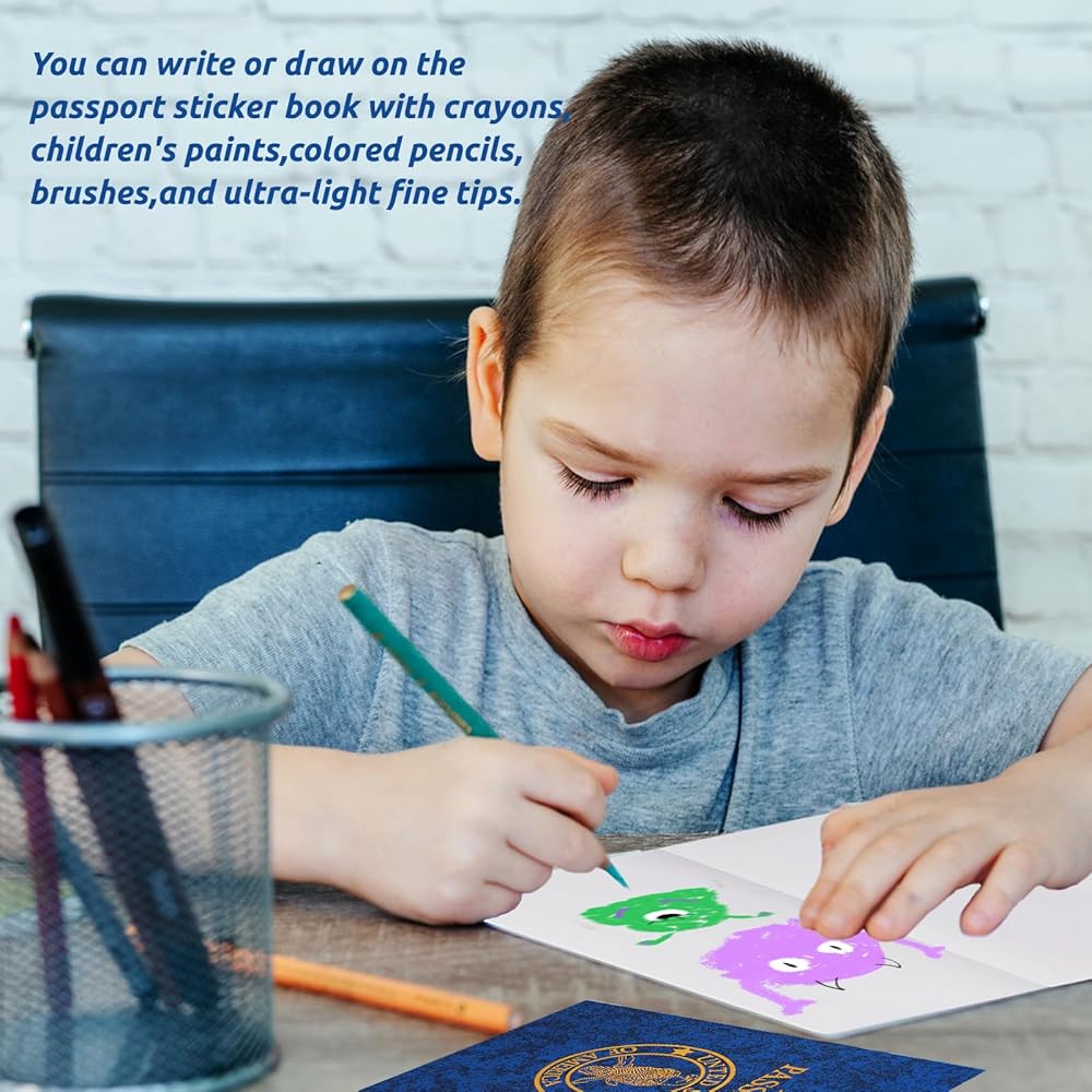 • تصميم فريد: يمكنك الكتابة أو الرسم على كتاب ملصقات جواز السفر باستخدام أقلام التلوين ودهانات الأطفال والأقلام الملونة والفرش والأطراف الدقيقة الخفيفة للغاية. يمكنك أيضًا إنشاء دفتر جواز سفر باستخدام الطوابع والملصقات.