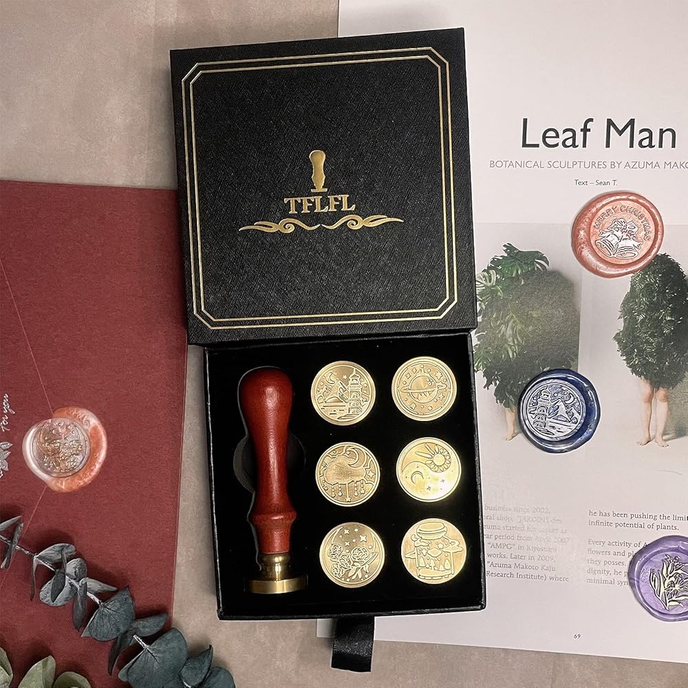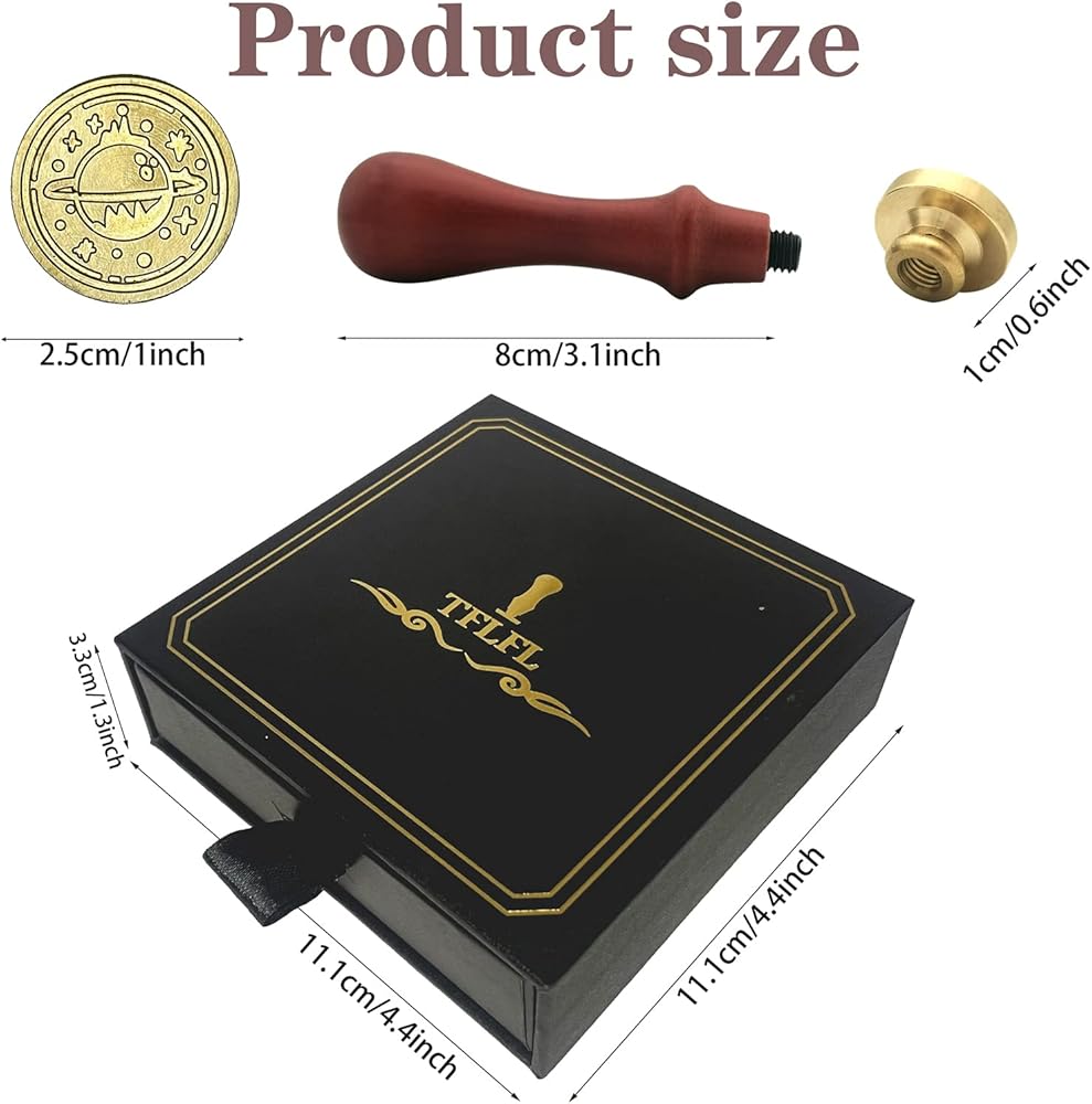 مجموعة طوابع ختم الشمع من TFLFL، 7 قطع من رؤوس ختم الشمع على شكل نجمة القمر مع مقبض خشبي صندوق هدايا عتيق مخصص لحفلات الزفاف ومغلفات الحروف وبطاقات التهنئة