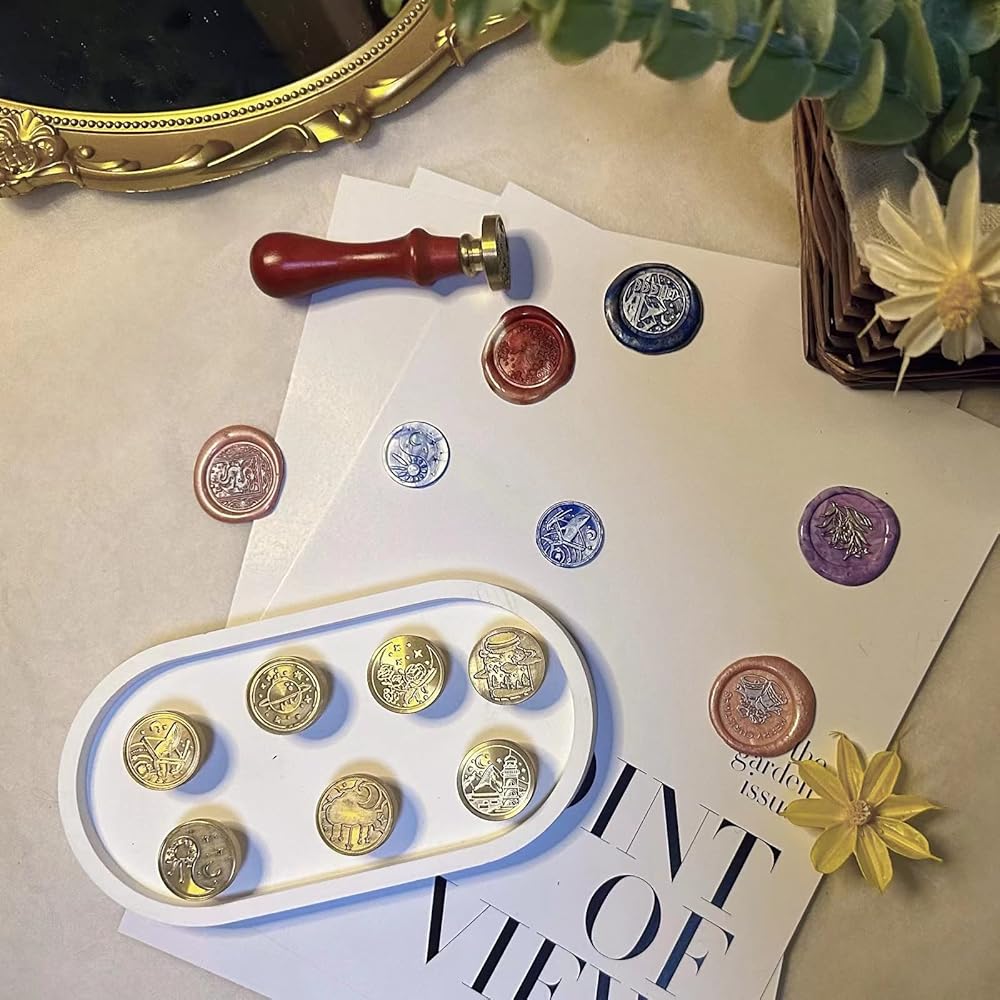 الأنماط: تتميز مجموعة ختم الختم على شكل ظرف الشمع بأنماط غامضة من 7 نجوم قمر مع معاني جميلة وطبقات متعددة من التفاصيل. غابة ليلية في زجاجة، جبل منارة تحت القمر، مطر نجمي مع سحابة قمر، آيس كريم نجمي، وردة في نصف قمر، قيطس يطير تحت القمر مثل الحلم. إضافة لمسة من سحر العالم القديم إلى مراسلاتك المكتوبة.