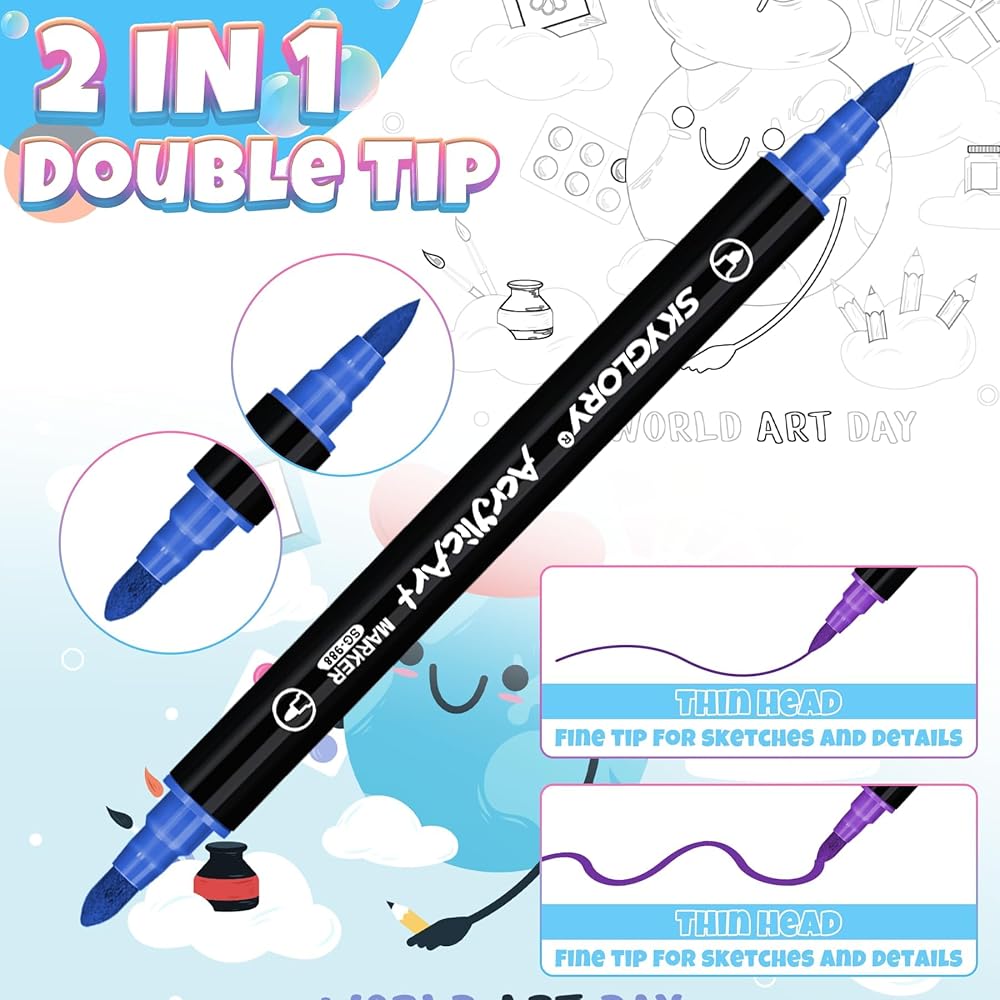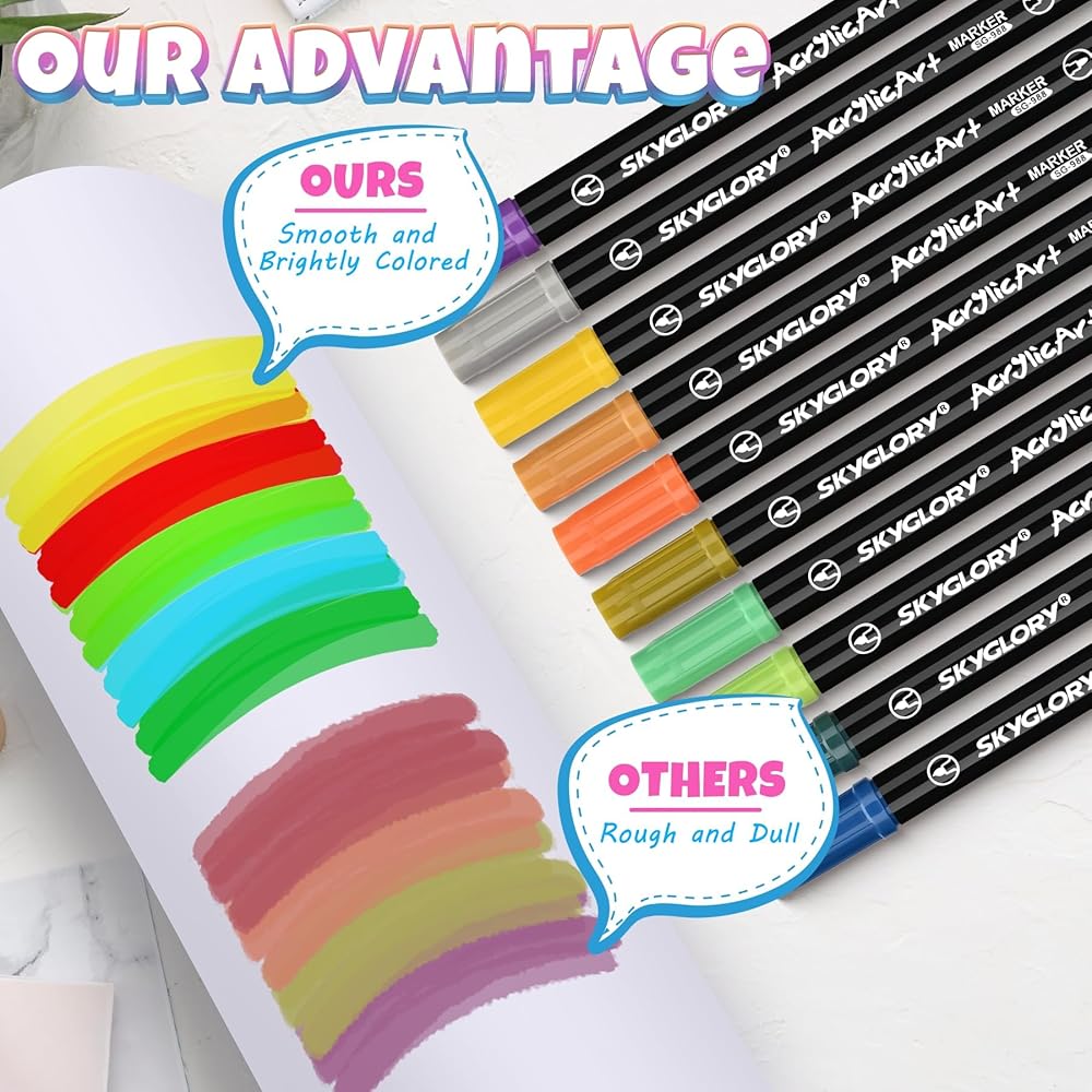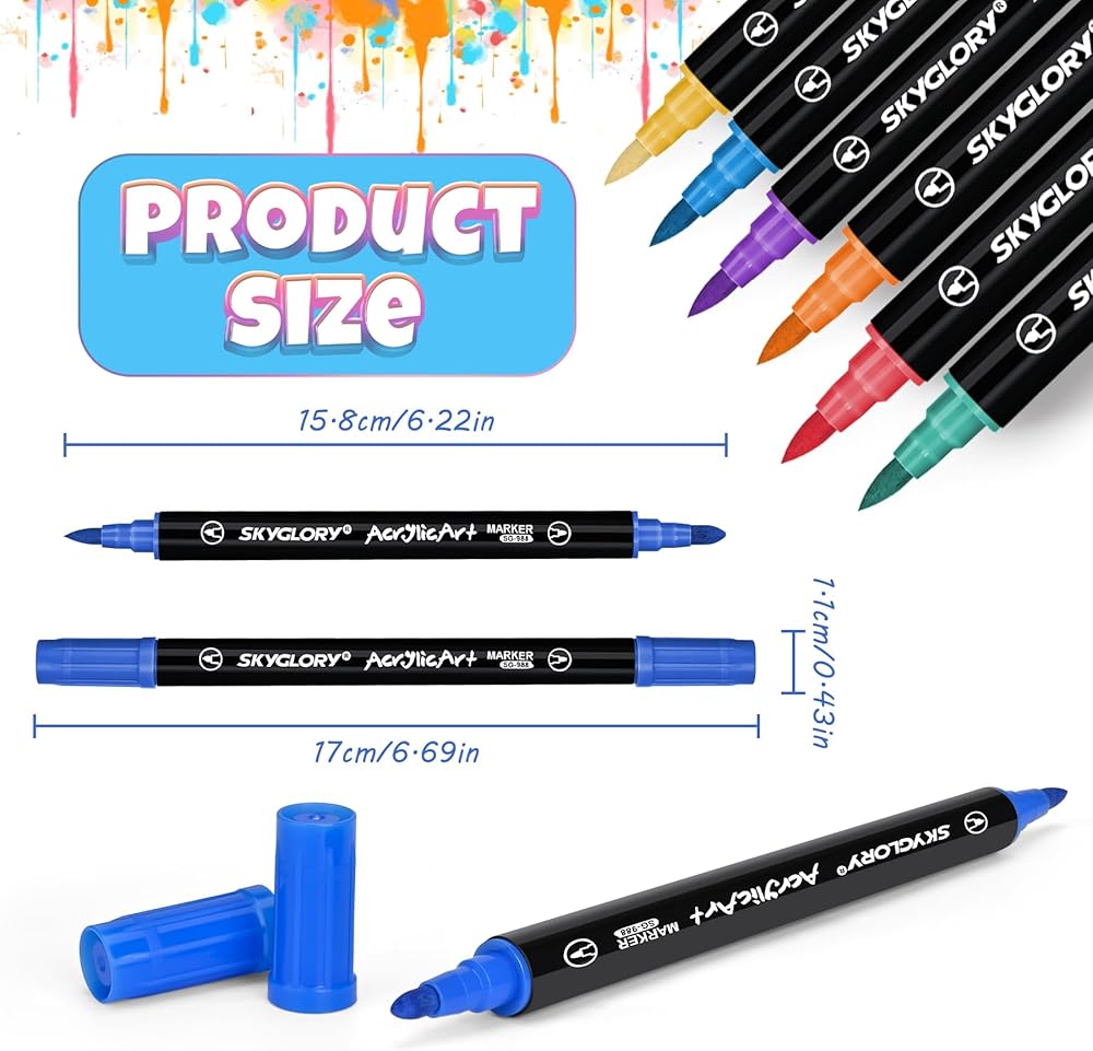 🆕[أقلام تحديد أكريليك مزدوجة الأطراف جديدة] تأتي أقلام طلاء الأكريليك ذات الرأس المزدوج مع طرف دائري 1-2 مم وطرف رفيع 1-3 مم مصنوع من شعيرات النايلون المتينة. يمكنك الرسم والتخطيط والخط والخطوط العريضة باستخدام السن الرفيع. يساعدك السن السميك على تلوين مساحات كبيرة. لا تحتاج أقلام تحديد الطلاء الأكريليك المطورة إلى هز القلم والضغط على رأس القلم لإطلاق الحبر، ولكن يمكن استخدامها للطلاء مباشرة بعد الحصول على قلم التحديد الأكريليك، مما يمنحك تجربة رسم أكثر سلاسة ونعومة.