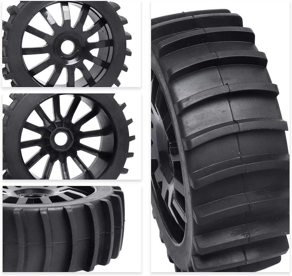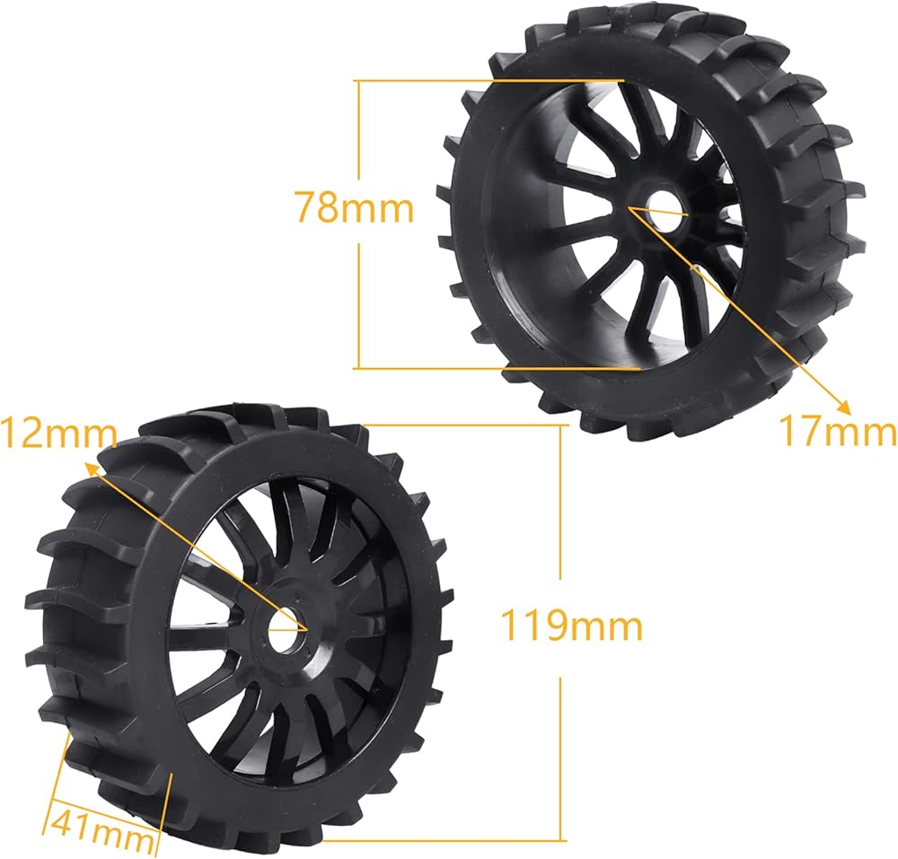 القطر الخارجي للإطارات: 4.68 بوصة (119 مم)، عرض الإطار: 1.61 بوصة (41 مم)؛ القطر الداخلي للعجلة: 3.07 بوصة (78 مم)؛ سداسي محرك العجلة: 17 مم/0.66 بوصة؛ قطر فتحة محور المحور: 12 مم/0.47 بوصة