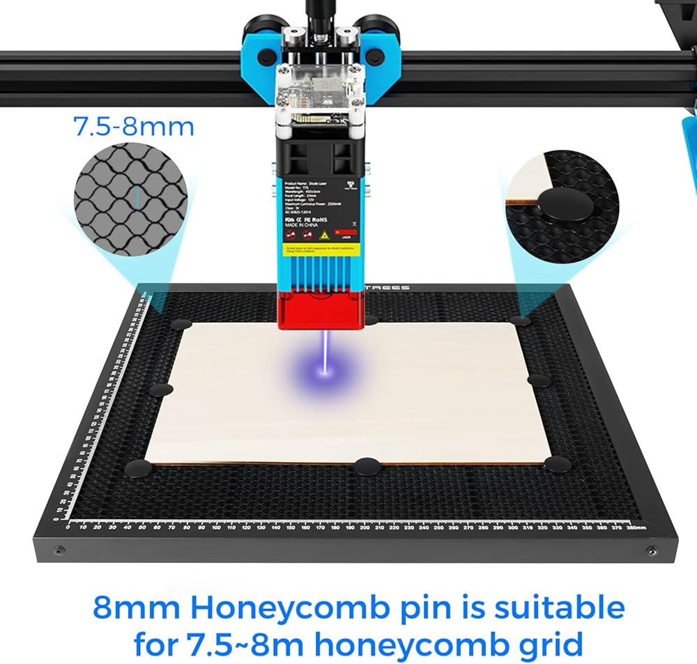 التطبيق: يمكن أن يحمل المواد الناعمة للقطع أو النقش باستخدام دبابيس قرص العسل في سرير الليزر على شكل قرص العسل. سيؤدي ذلك إلى تقليل الاختبارات والفوضى ويمنحك منتجًا أفضل بكثير. أداة يجب اقتناؤها لأي نقش بالليزر.