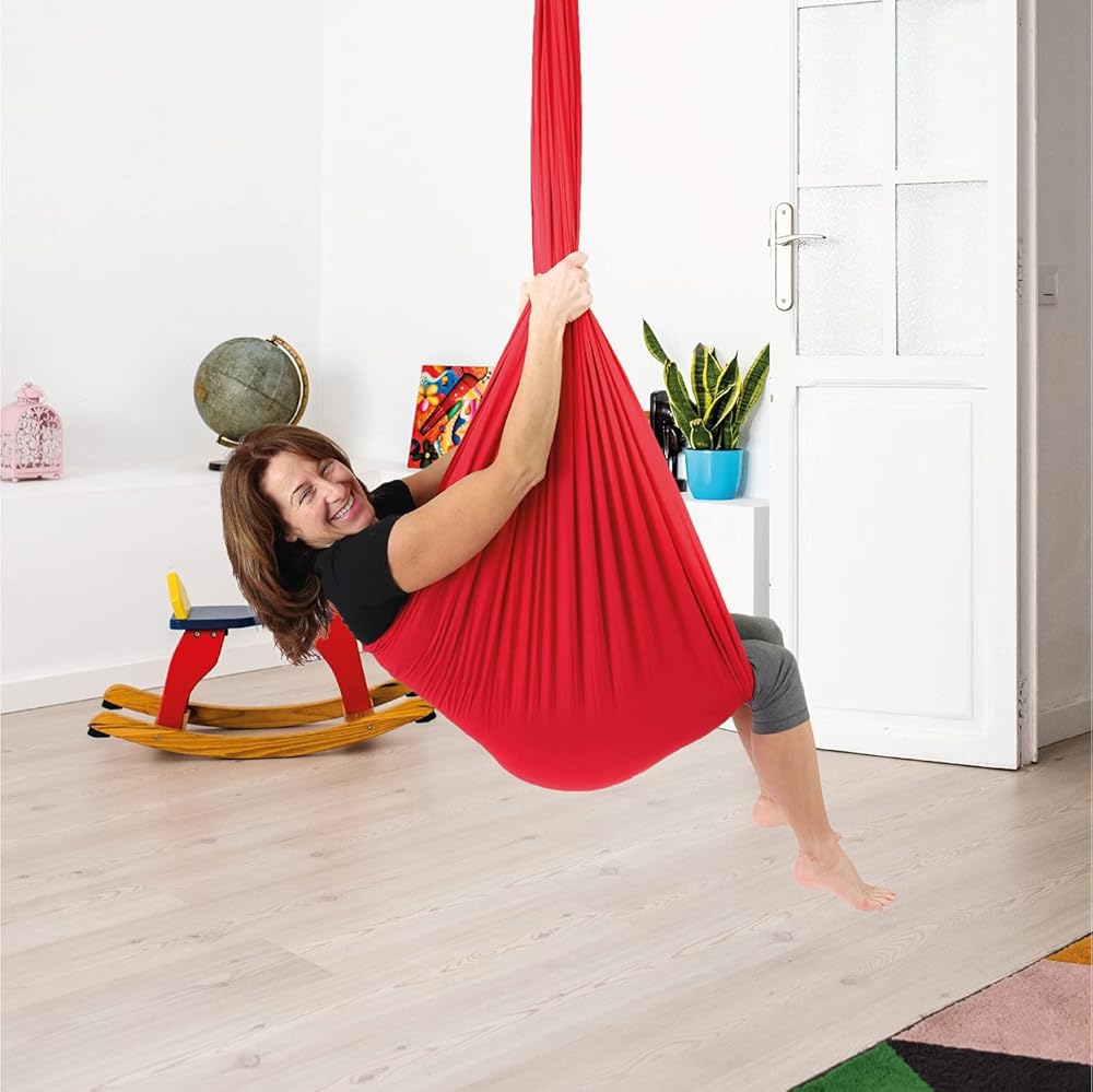 أرجوحة الاحتضان هذه هي جهاز بسيط جدًا، نسيج مطاطي رباعي الاتجاهات يضغط الشخص من الداخل ويهتز ظهره وإيابا، لأعلى ولأسفل، من جانب إلى آخر. يوصي به أطباء العلاج المهني ويمكن استخدامه للعلاج المنزلي. الحد الأقصى للوزن هو 220 رطل (100 كغم). تأتي أرجوحة العلاج العلاجية مع قطعتين من الحبل، ومشبك زنبركي ومسمار تأخير العين لسهولة التركيب.
