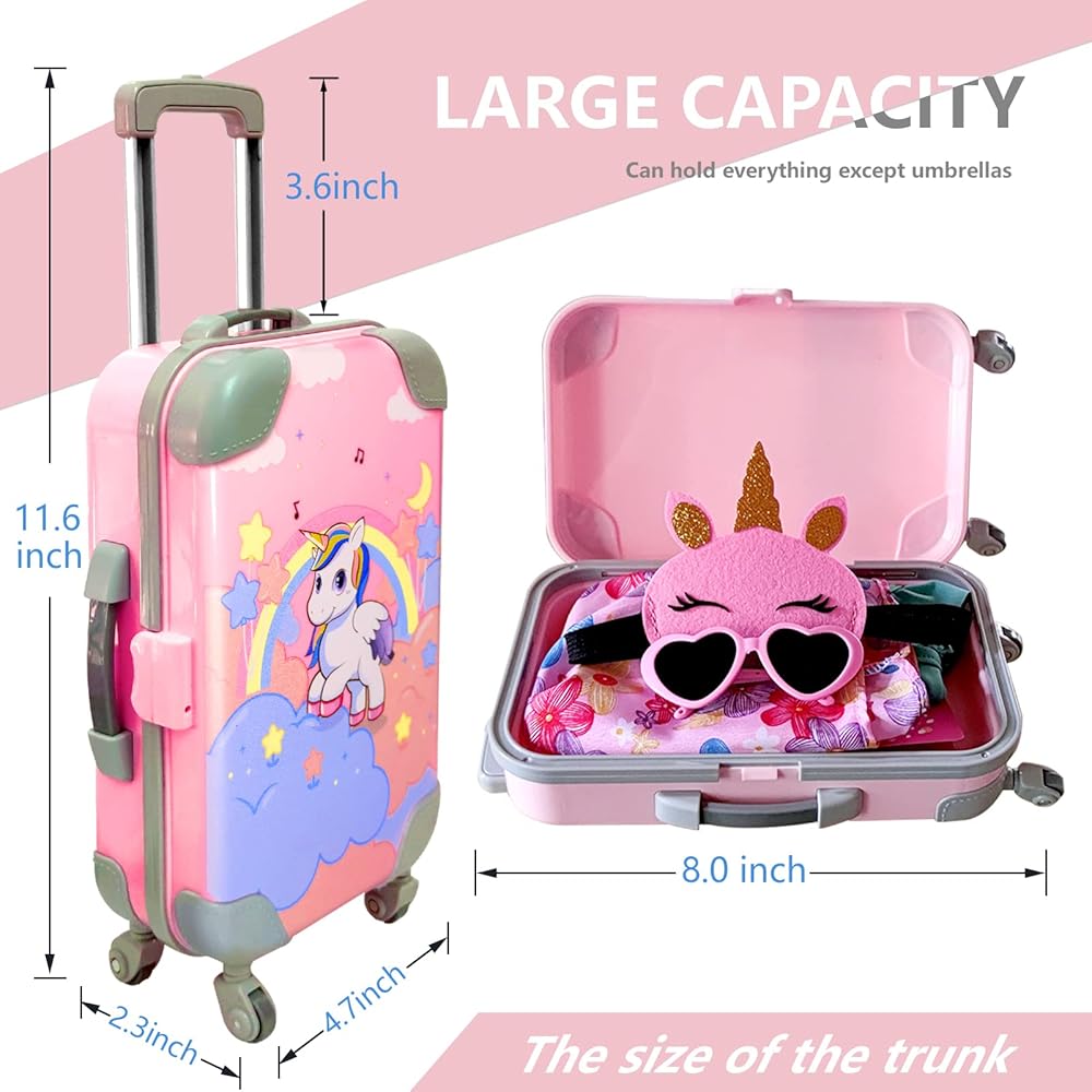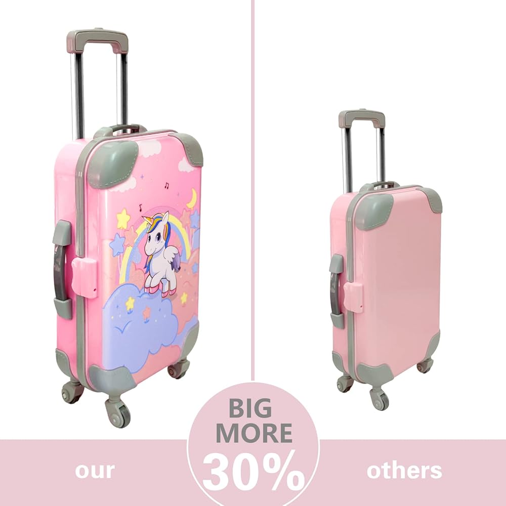 【حقيبة سفر واقعية ومتينة تجلب تجربة مذهلة】يمكن لحقيبة السفر ذات السعة الكبيرة حمل جميع الأغراض في مجموعة السفر (باستثناء المظلة). يمكن للأطفال أيضًا استخدامها لتخزين الألعاب الصغيرة الأخرى. تحتوي حقيبة الدمى الخاصة بنا على أربع عجلات دوارة، مما يجعلها أكثر واقعية! يمكن للمقبض القابل للتعديل التحرك لأعلى وأسفل. مقاس الحقيبة 6.7 انش ارتفاع × 4.7 انش عرض × 2.3 انش عمق.