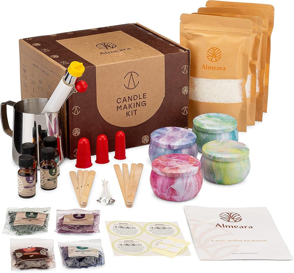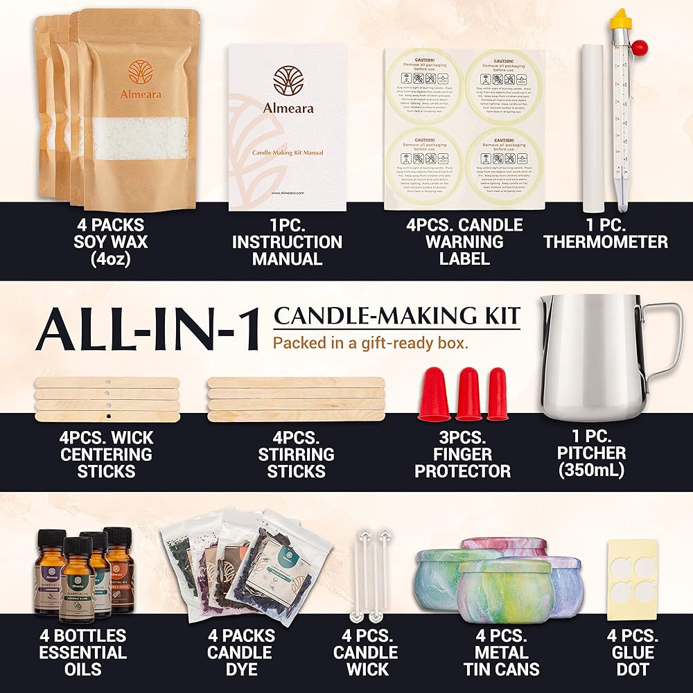 Good for 4 candles: It comes with all accessories that you need to make a total of 4 soy wax candles from wax candle making kits for adults. The Almeara candle making supplies kit also includes a stainless steel pitcher, thermometer, and stirring sticks for your convenience.