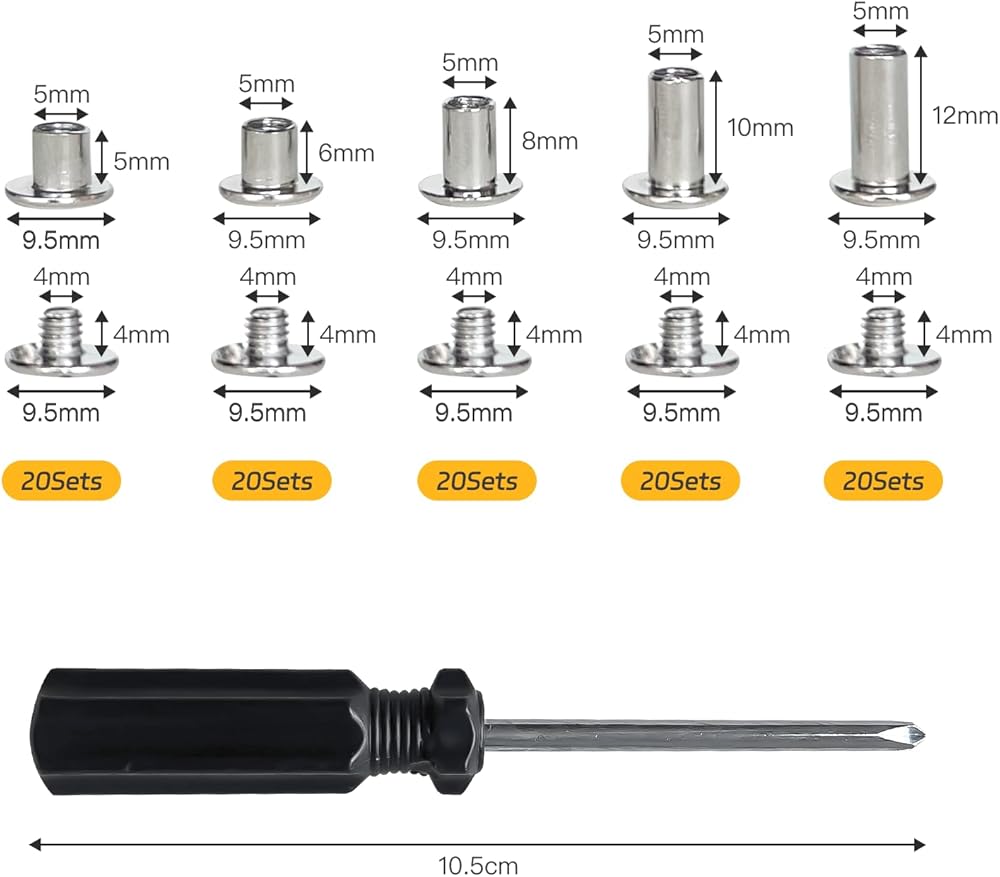 المقاس: 100 مجموعة من المسامير الجلدية اليدوية في 5 مقاسات، بأطوال 1/5 بوصة (5 مم)، 1/4 بوصة (6 مم)، 5/16 بوصة (8 مم)، 2/5 بوصة (10 مم)، 1/2 بوصة (12 مم)، كل مقاس 20 مجموعة، بقطر 1/5 بوصة (5 مم).