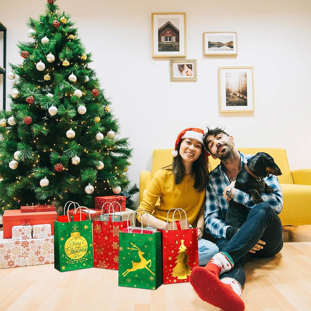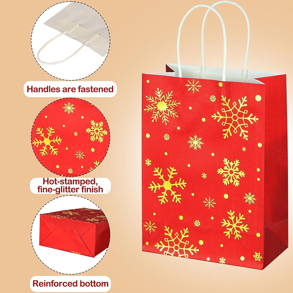 جودة جيدة: حقائب هدايا عيد الميلاد الصغيرة مصنوعة من ورق رقائق الذهب الساخن السميك، مع بريق ناعم، لا تتمزق بسهولة. يمكنك استخدامه لحمل هدايا صغيرة أو حتى أشياء أثقل.
