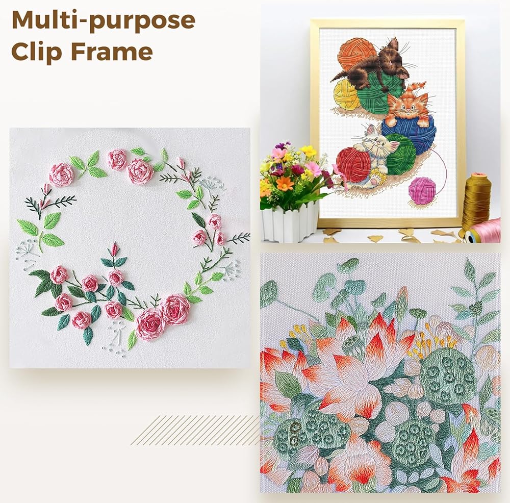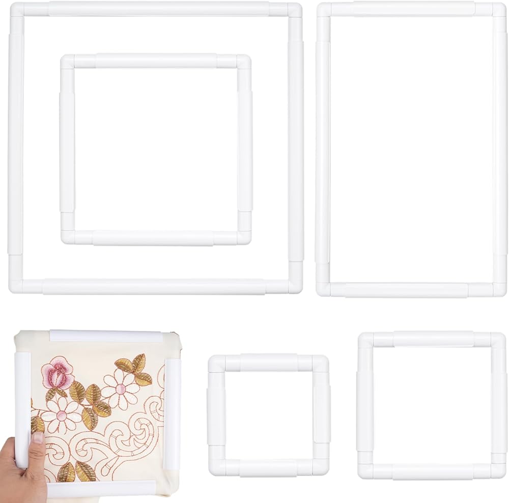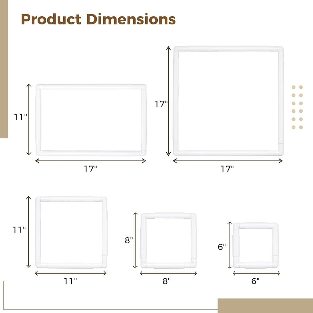 5 Embroidery Frames in Different Sizes You will receive five square embroidery clip frames in different sizes, 6" x 6", 8" x 8", 11" x 11", 17” x 11”, and 17” x 17”, meeting different needs for punch needle, cross sch, sewing, embroidery, quilting, needlepoint, silk painting, and other craft projects.