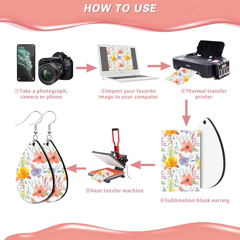 كيفية الاستخدام - قبل الاستخدام، يرجى تمزيق الغشاء الواقي على سطح الفراغات التسامي، وحدد درجة حرارة آلة النقل بين 180 - 190 درجة مئوية/ 356 - 374 فهرنهايت. يمكنك الطباعة على كلا الجانبين لأنه طلاء على الوجهين. بعد المعالجة، اتركي فارغتك بالانتعاش جيدًا. استخدم كماشة لربط حلقة القفز وخطاطيف الأقراط. ثم قم بتغليف الأقراط باستخدام الورق المقوى وحقيبة مختومة، قم بإنهاء مشاريعك DIY