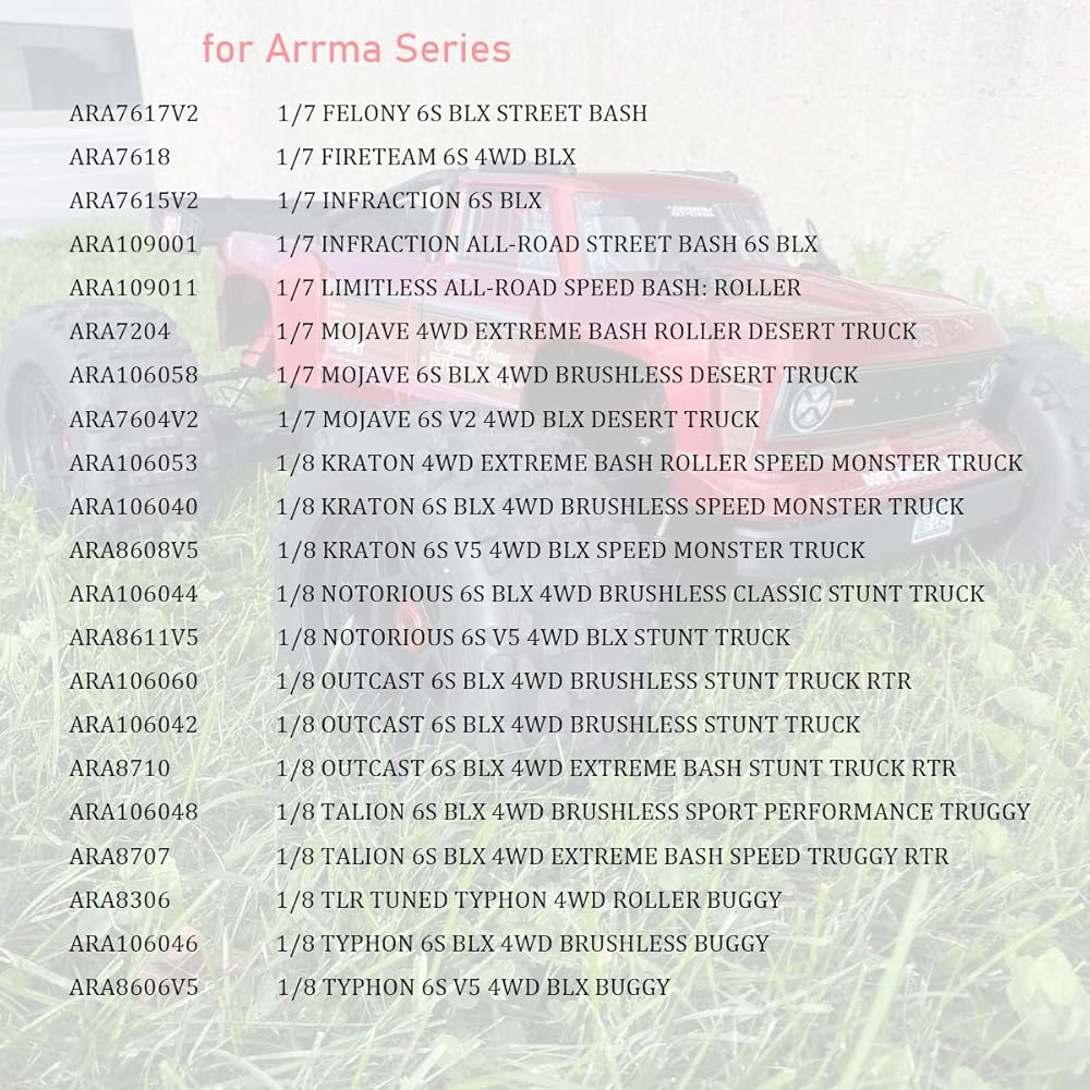 متوافق أيضًا مع ارما 1/8 كراتون 6 اس بي ال اكس، 1/8 نوتوريوس 6 اس بي ال اكس، 1/8 اوت كاست 6 اس بي ال اكس، 1/8 تاليون 6 اس بي ال اكس، 1/8 تيفون 6 اس بي ال اكس، 1/8 تي ال ار توند تيفون 4 دبليو دي رولر