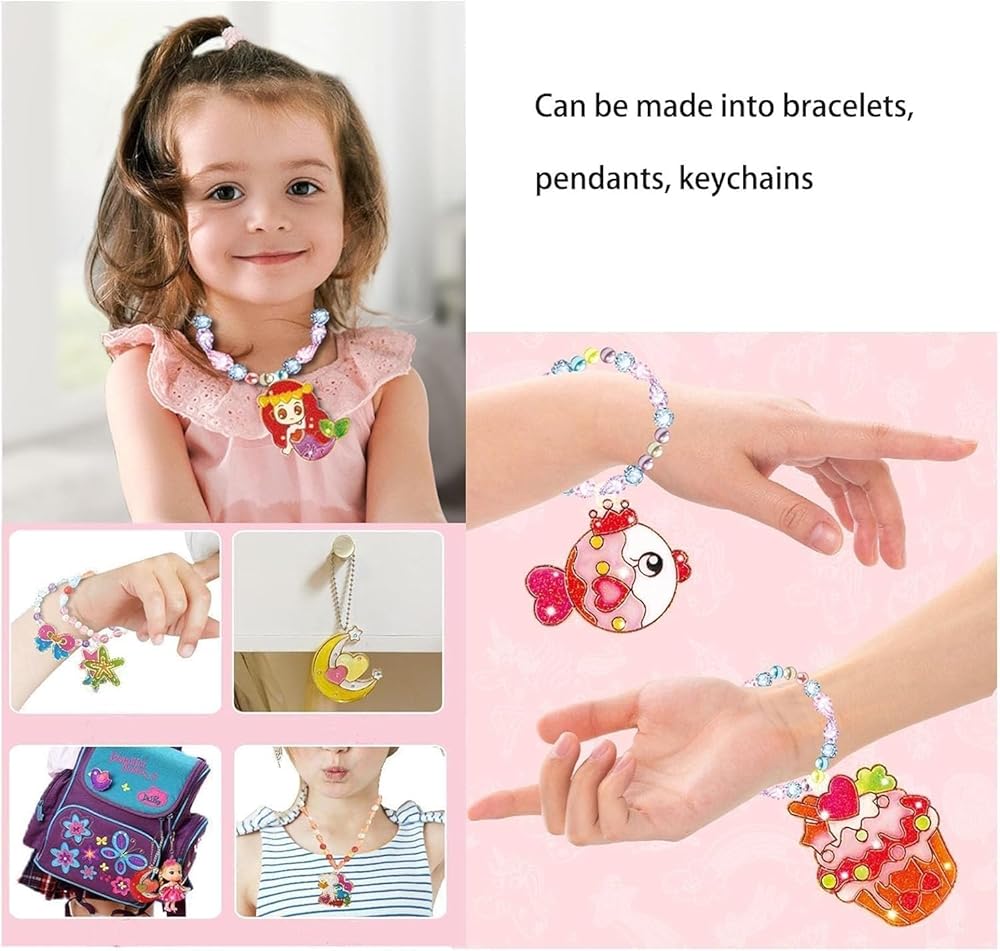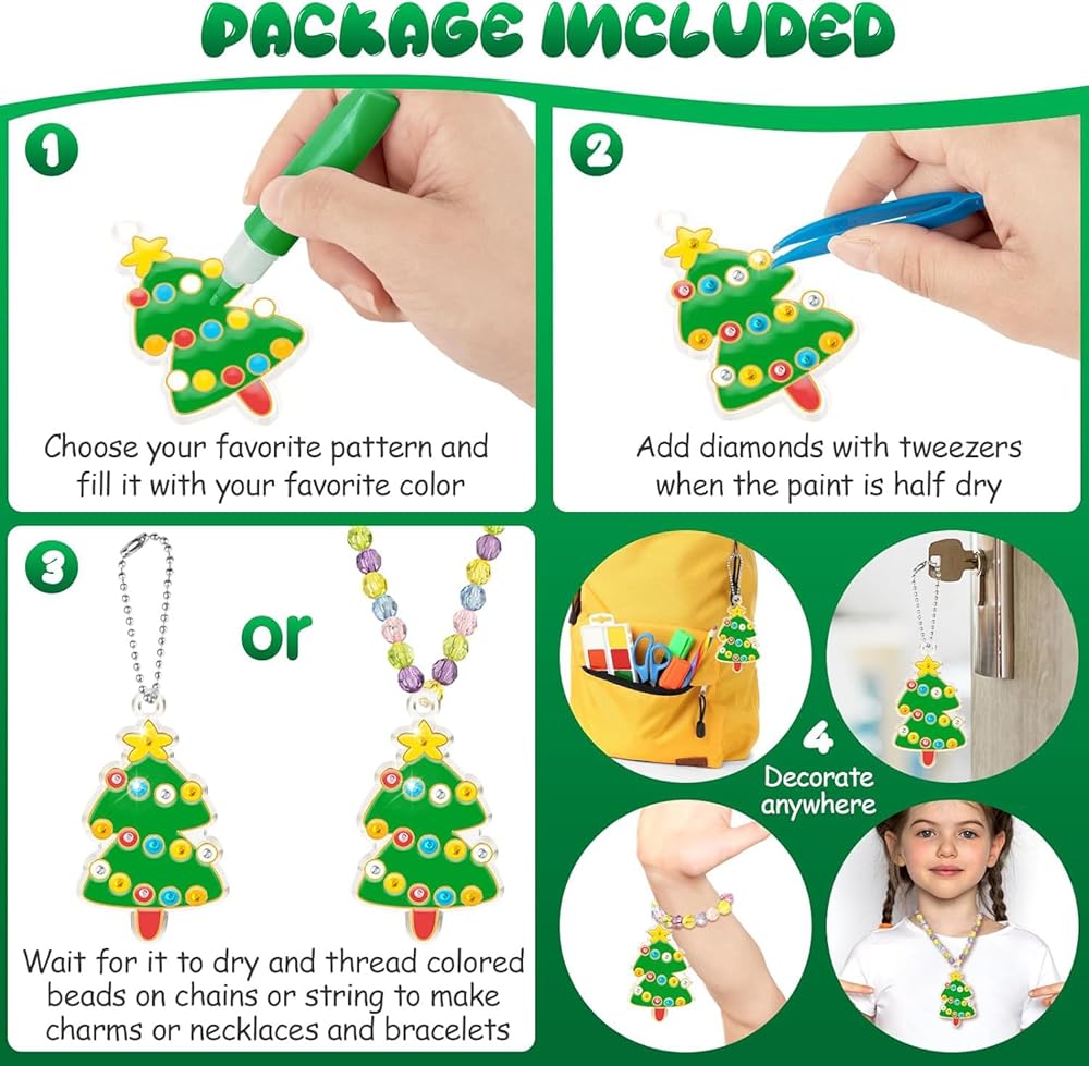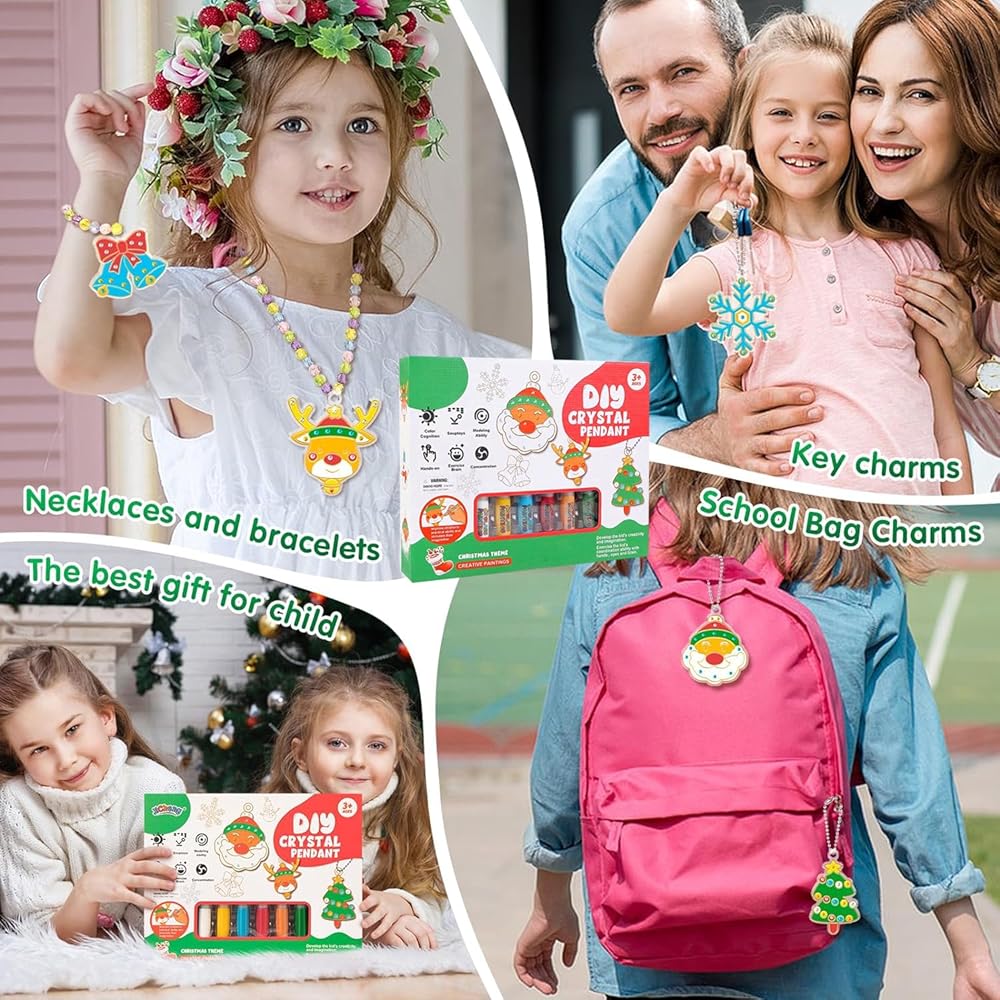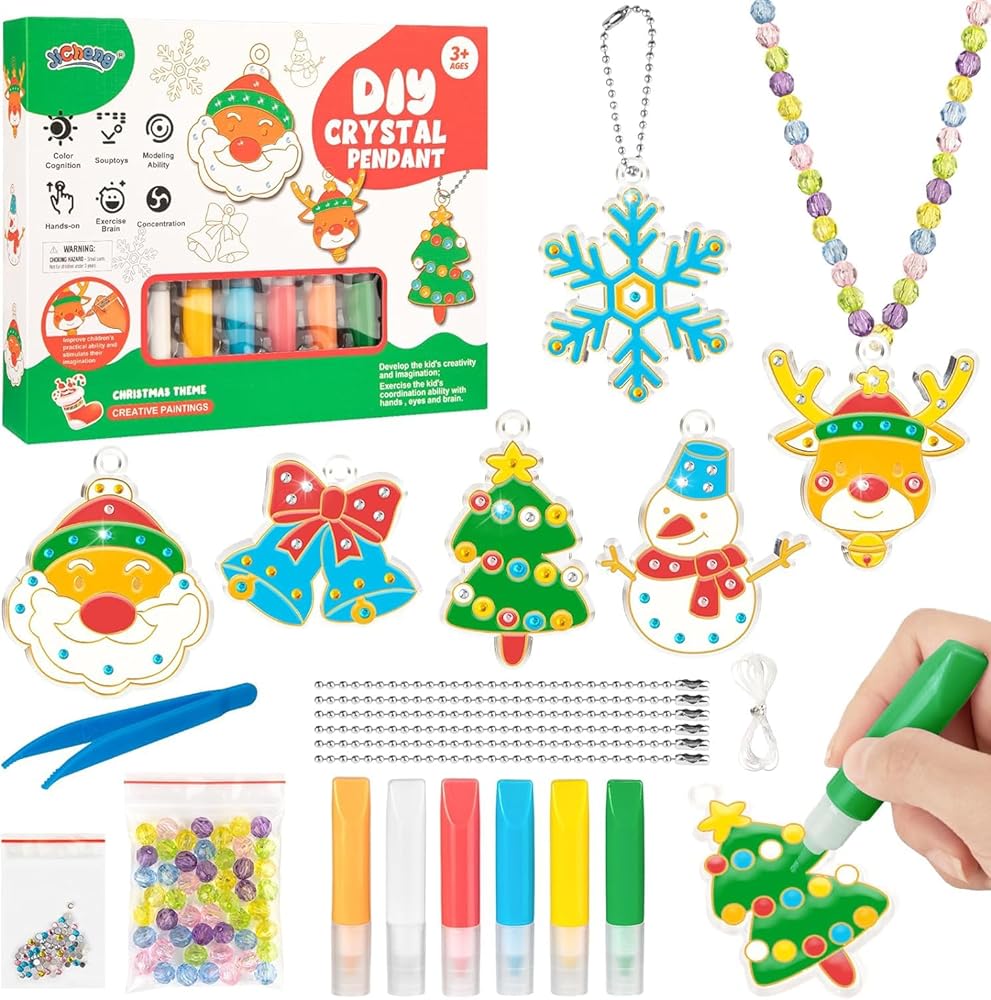 مجموعة الفنون والحرف اليدوية لطلاء كريستال عيد الميلاد - 6 معلقات كريستالية 6 ألوان طلاء 6 سلاسل 1 ملقط 3 عبوات من خرز الماس الكريستالي 1 حزمة خرز ملون 1 حبل سلسلة - طقم قلادة كريستال DIY ماسي