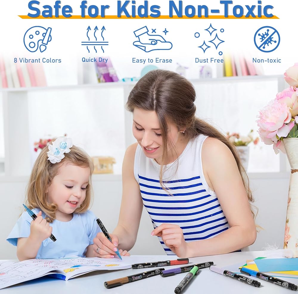 8 ألوان نيون زاهية - تستخدم أقلام الطباشير الدقيقة من Timart حبرًا جديدًا مطورًا يجلب المزيد من الألوان الفلورسنت لعملائنا. جميع الألوان مصبوغة للغاية ونابضة بالحياة وتدوم طويلاً.