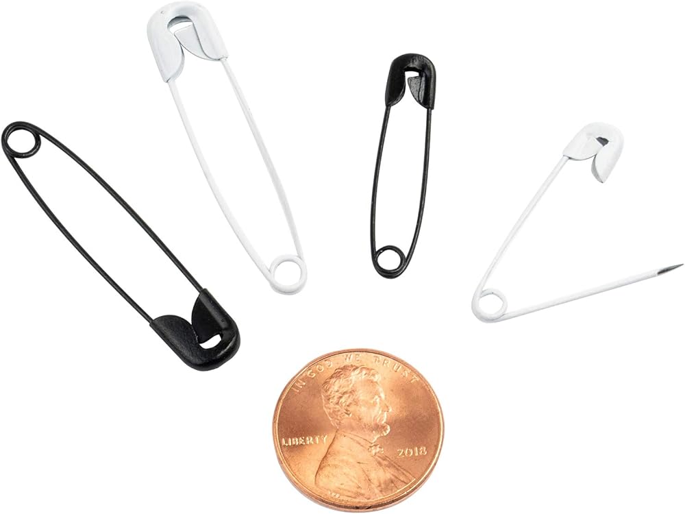 يحتوي الصندوق على دبابيس أمان معدنية بأحجام متنوعة. مزيج من الدبابيس السوداء والبيضاء.