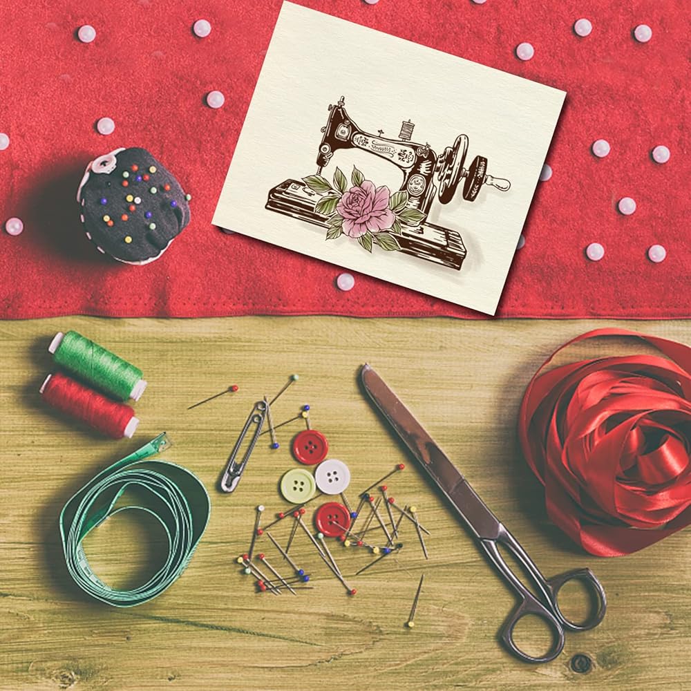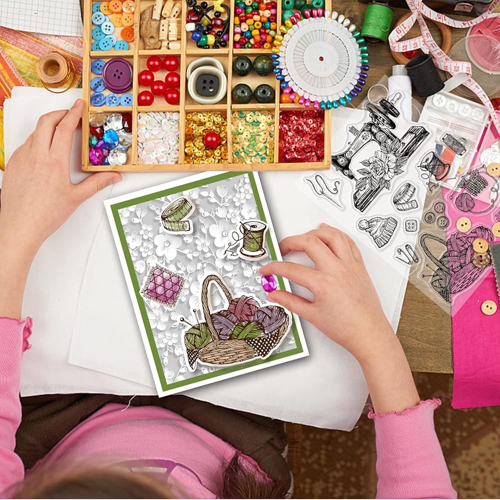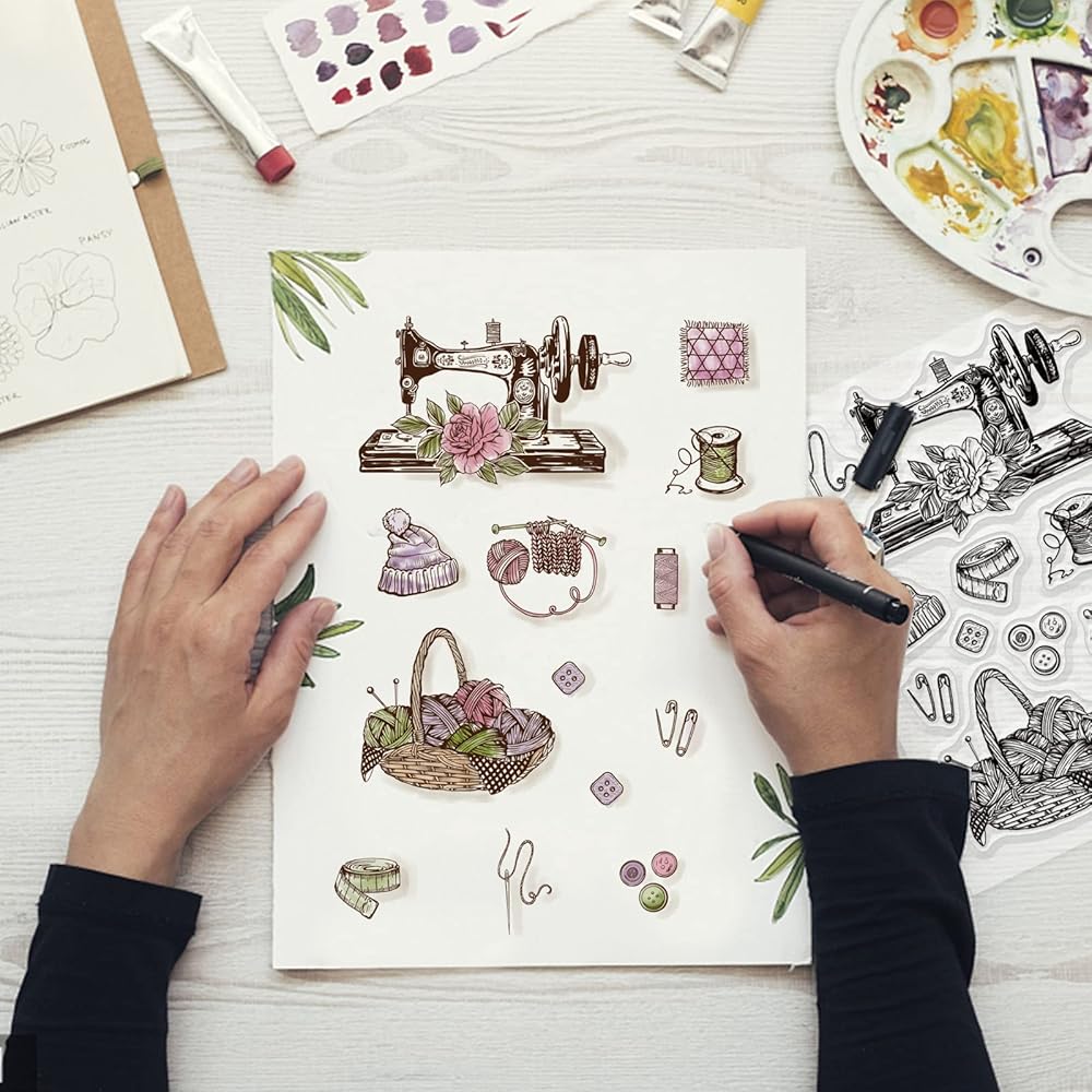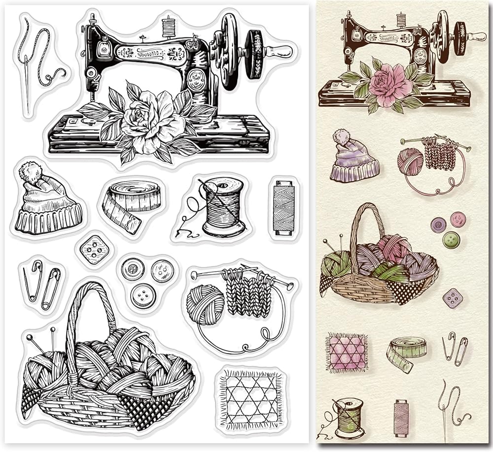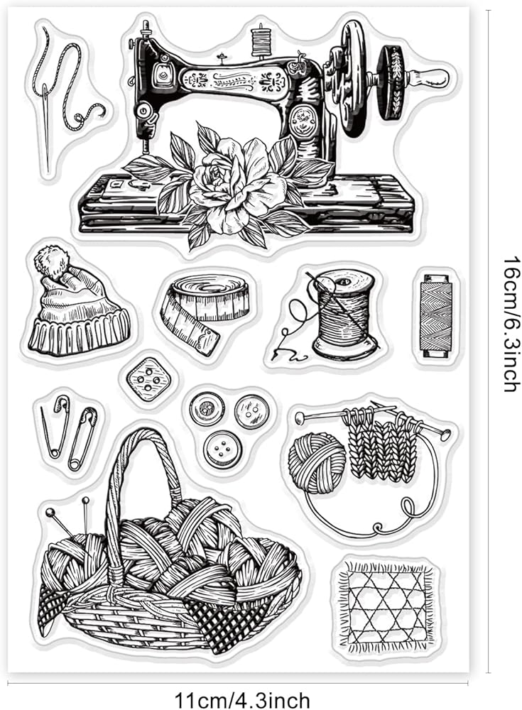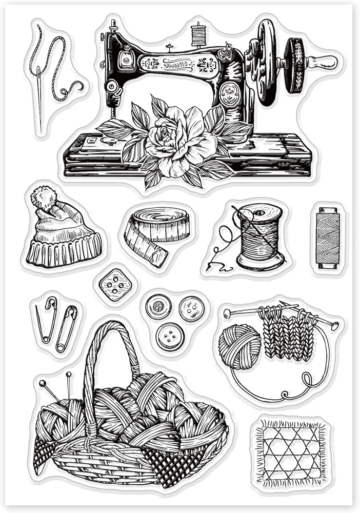 موضوع الخياطة: تتضمن عناصر الختم الشفاف بعض آلات الخياطة العتيقة والصوف والبكرات والمزيد. هذه العناصر جميلة وقريبة من الحياة. إنها رائعة لسجل القصاصات أو بطاقات المعايدة.