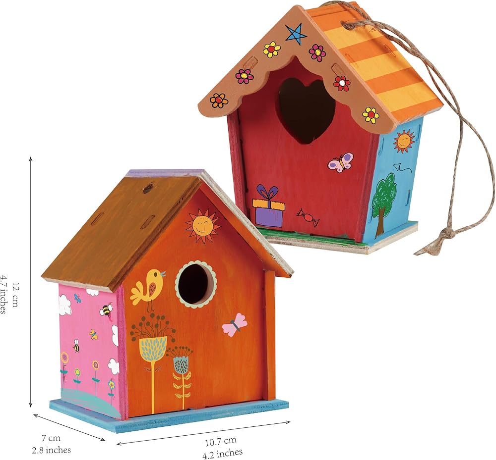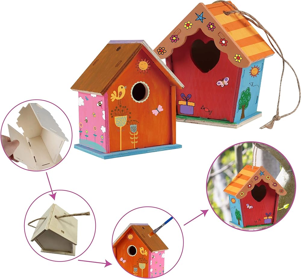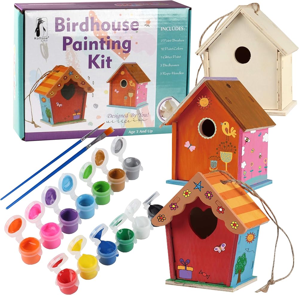 مجموعة بيت الطيور DIY للأطفال، مجموعة بناء يور أون بيرد هاوس للأطفال، تتضمن 3 بيوت طيور غير مكتملة للطلاء والبناء والحبال و12 طلاءً وطلاء لامع وفرشتين وفنون وحرفية للأطفال