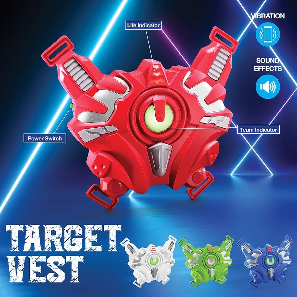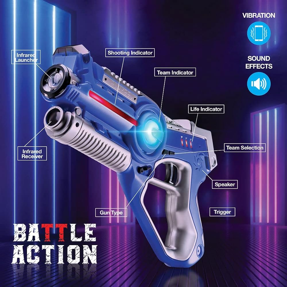 تحتوي لعبة مسدس الليزر على العديد من الميزات المفيدة وصوت رائع و4 ألوان من الأزرق الفاتح، والأحمر، والأخضر، والأبيض، والتي يمكن اللعب بها مع 4 فريق.