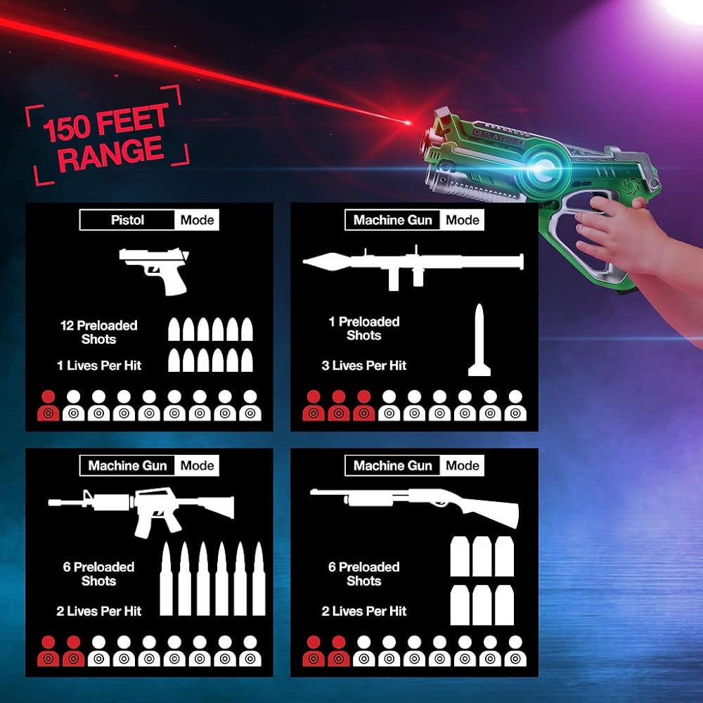 مجموعة بطاقات ليزر مع سترات تأتي مع 4 أنواع مسدسات: مسدس: مع 12 رصاصة، لتقليل قيمة حياة نقطة واحدة إذا اصطدمت - مسدس: مع 6 رصاصات، لتقليل قيمة الحياة بنقطة 2 إذا اصطدمت - مسدس آلي؛ مع 6 رصاصات، لتقليل قيمة الحياة 2 نقطة إذا اصطدمت صاروخ: مع صاروخ واحد، لتقليل قيمة الحياة 3 نقاط إذا اصطدمت