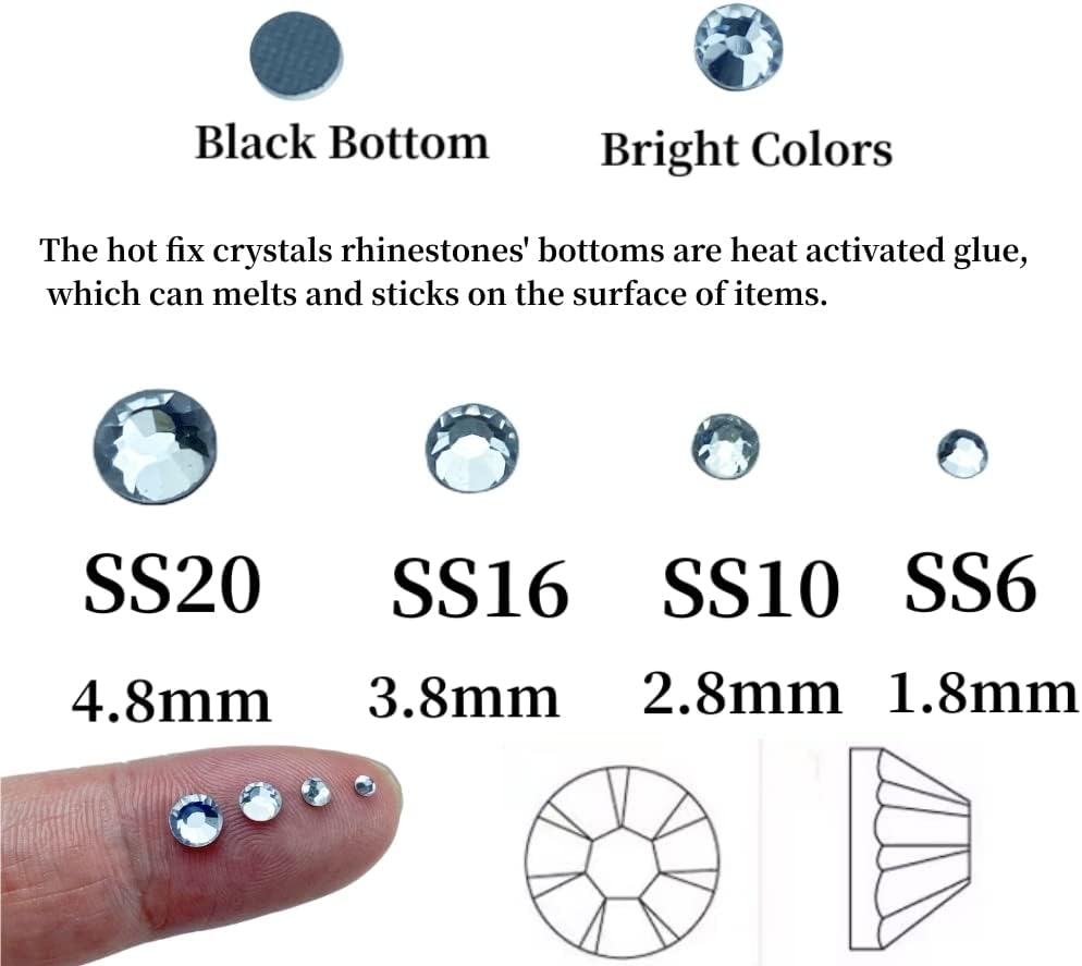 المواد: أحجار الراين ذات الظهر المسطح مصنوعة من مادة زجاجية عالية الجودة، وقطع متعدد الجوانب، وسطوع عالي، ولامع، وأسطح ناعمة ومتينة، وليس من السهل كسرها أو تشوه. الجزء السفلي من أحجار الراين الكريستالية الساخنة عبارة عن غراء منشط بالحرارة، والذي يمكن أن يذوب و تلتصق على سطح ملابسك أو حذائك أو غيرها من الأشياء عند تسخينها، من السهل عمل مشروع الحرف اليدوية الخاص بك، وعمل أنماط مختلفة، والألوان الوفيرة والمشرقة يمكن أن تجعل أعمالك اليدوية أكثر تميزًا.