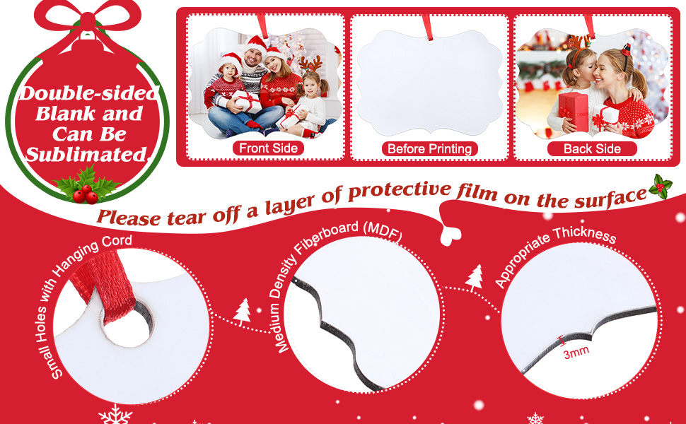 • هذا المنتج فارغ على الوجهين ويمكن تصفيفه. يمكنك تخصيص الصورة العائلية على سطح المنتج، وDIY وفقًا للتصميم المفضل لديك لضمان أنه يجلب جوًا احتفاليًا عند تزيين المنازل أو الأشجار لعيد الميلاد. تجلب عائلتك إحساسًا جيدًا بالتجربة.