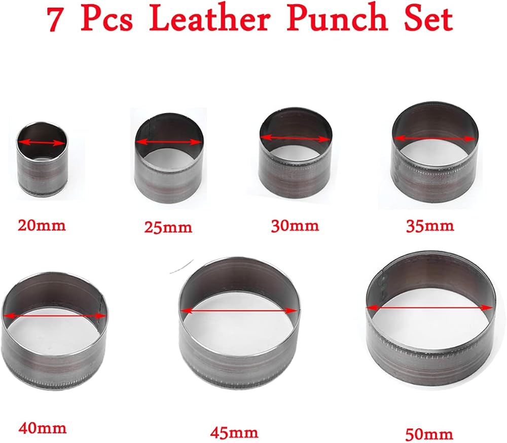 【A Complete Set of 7-piece Circular Punching Tools】The circular punching die has 7 variety of sizes, including: 20mm/0.78in, 25mm/0.98in , 30mm/1.18in, 35mm/1.38in, 40mm/1.57in, 45mm/1.77in, 50mm/1.97in.Satisfy your leather Treatment in various environments.