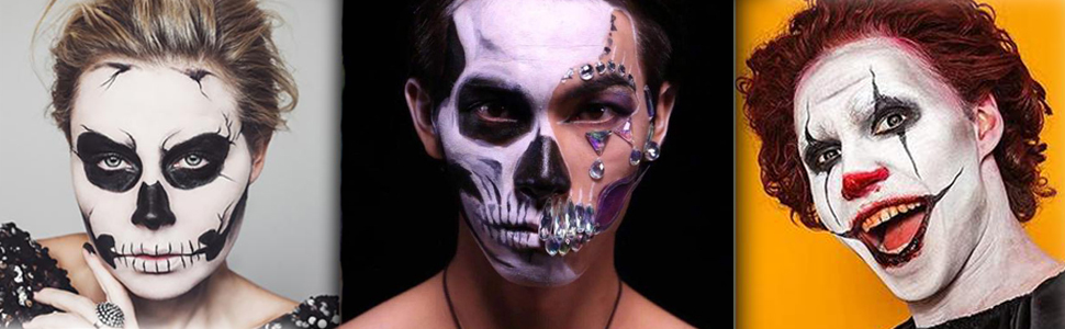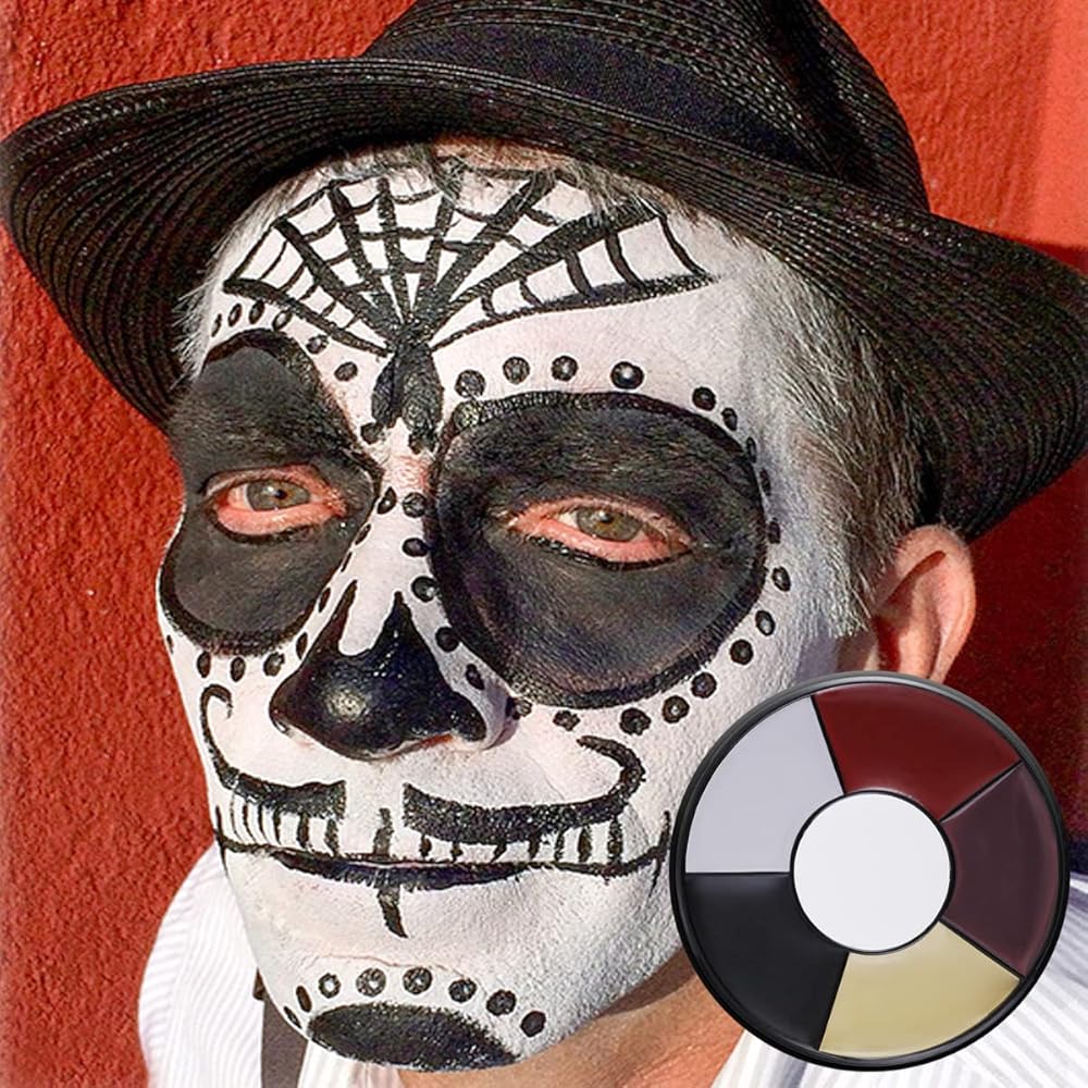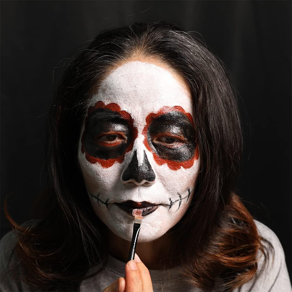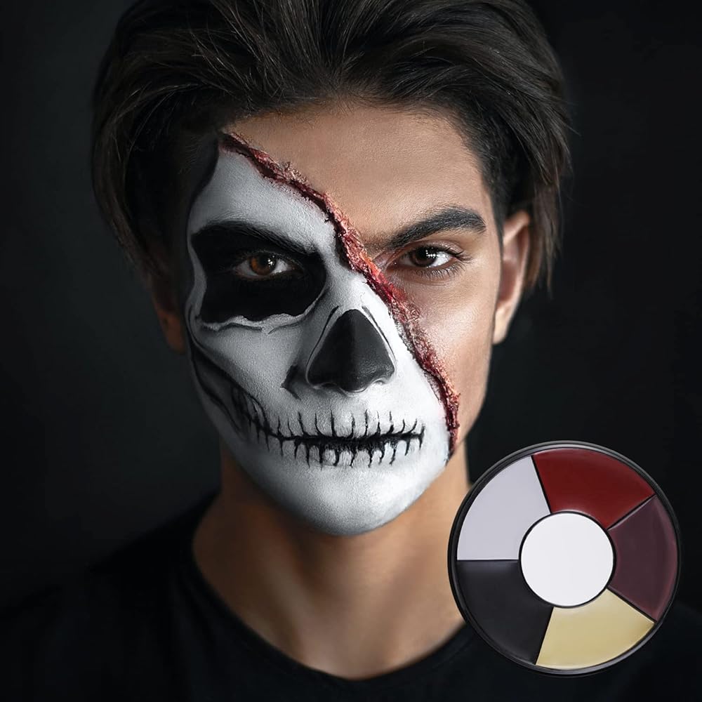 لوحة طلاء الوجه الأبيض المهرج من MEICOLY، عجلة الكوارث الرئيسية، مكياج الهيكل العظمي للجوكر، طلاء الوجه باللون الأحمر والأسود والأبيض، 6 ألوان طلاء للجسم مع 8 قطع من إسفنجات المكياج
