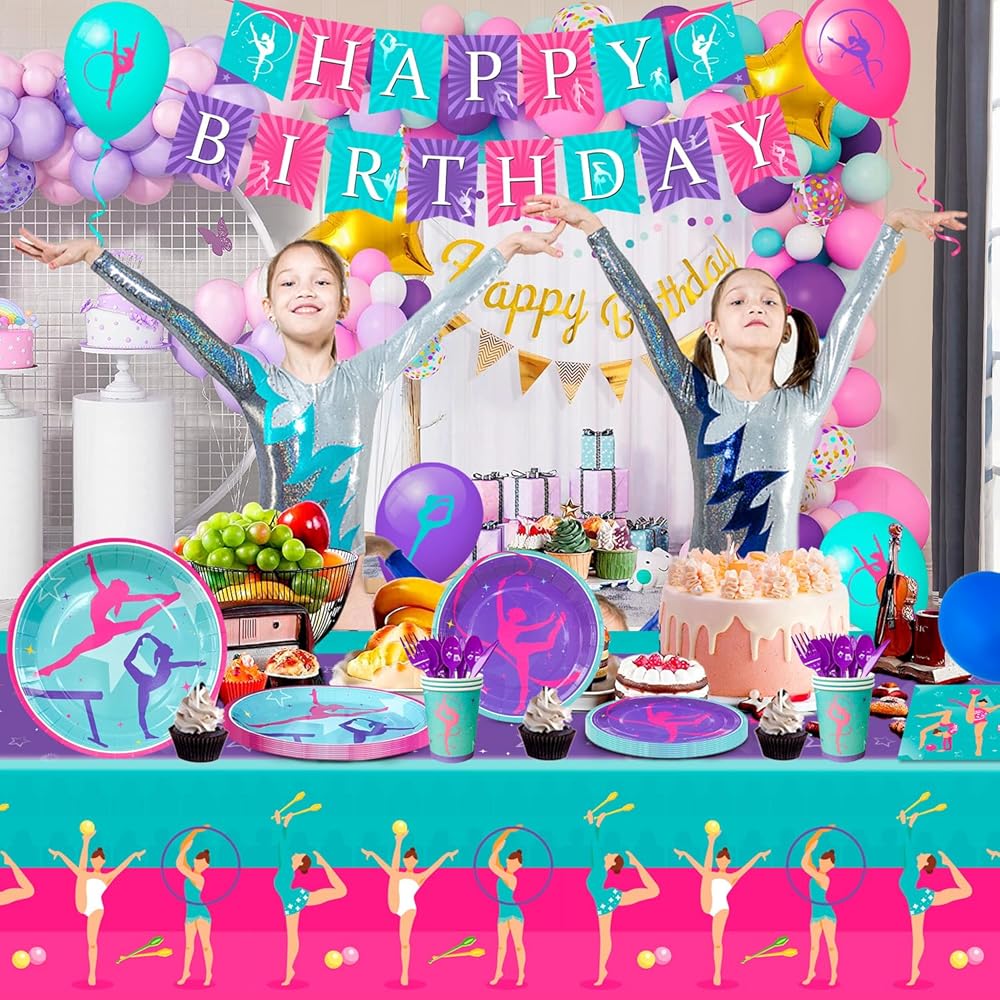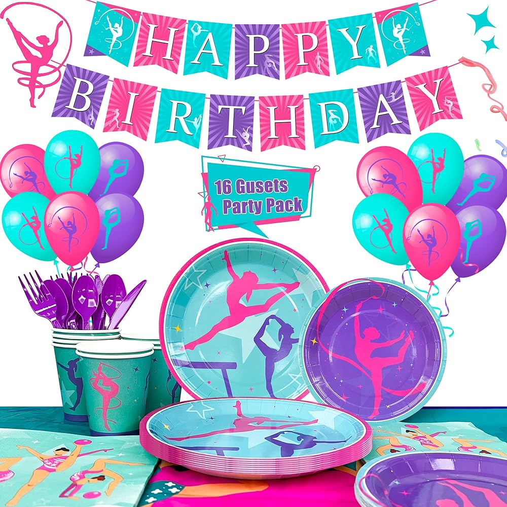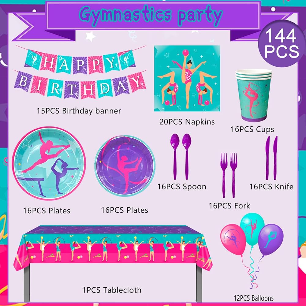مجموعة ديكورات أعياد الميلاد للجمبازة️【 تتضمن لوازم حفلات أعياد الميلاد بطابع الجمباز 12 بالونًا لحفلات أعياد الميلاد للجمباز، 16 طبق عيد ميلاد للجمباز مقاس 7 انش، 16 طبق حفلات عيد ميلاد للجمباز مقاس 9 انش، لافتة حفلة جمباز، 1 مفرش طاولة لحفلات أعياد الميلاد للجمباز، 3 لوحات معلقة للجمباز القواطع الديكور الخ صالة الألعاب الرياضية زينة حفلات علم ناستيكس.