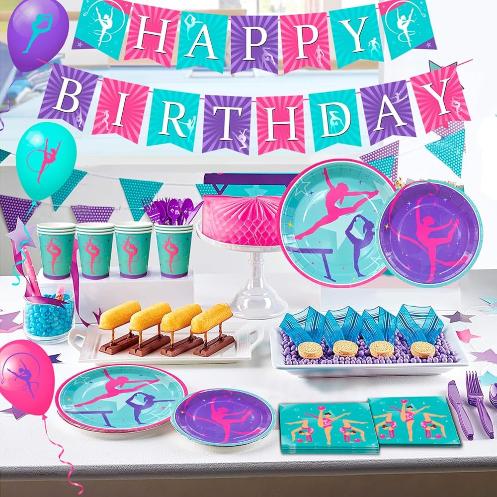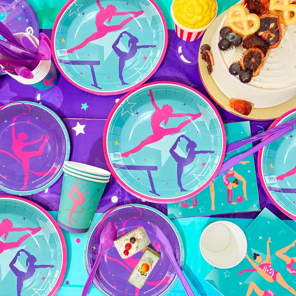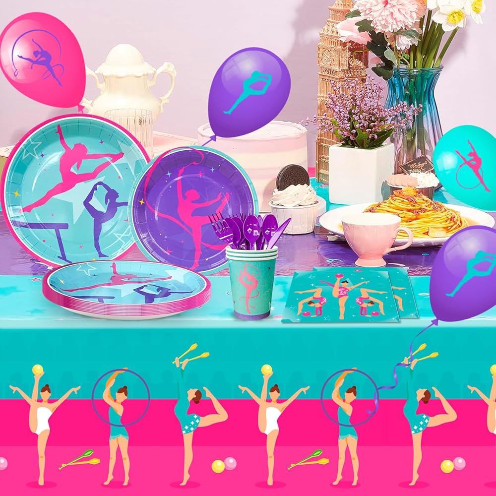 تصميم بألوان زاهية تم تصميم ديكورات الحفلات ذات طابع الجمباز بأنماط جمباز كلاسيكية مختلفة، تتميز بصور ظلية لاعبة الجمباز الأرجواني والأزرق المخضر، مما يبرز موضوع الحفلة، مما سيجعل حفلتك ذات طابع الجمباز مليئة بالمرح.