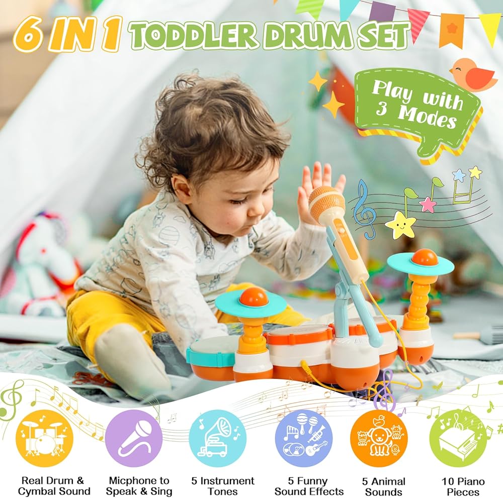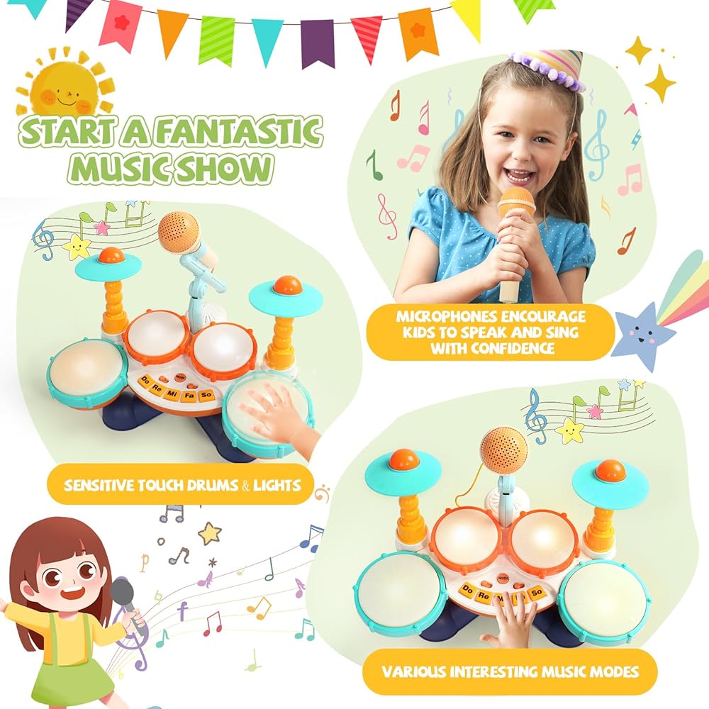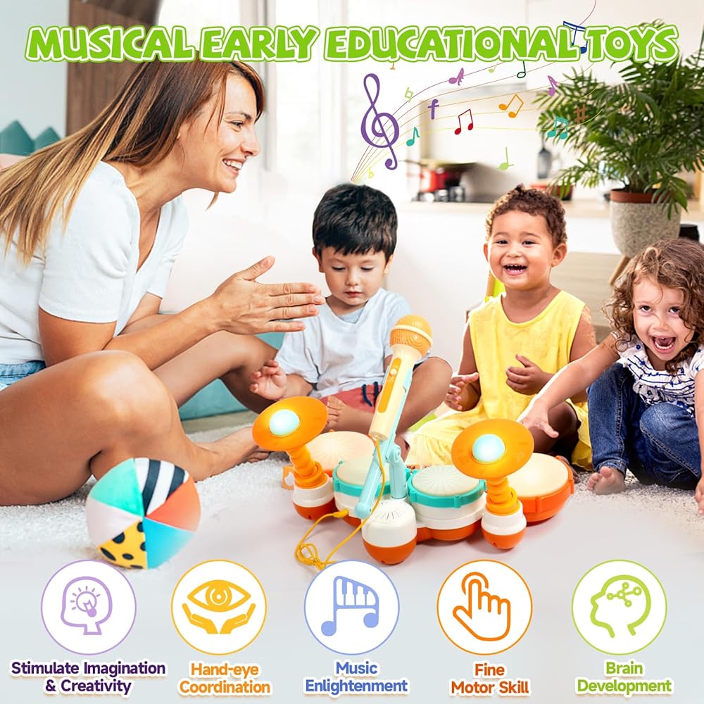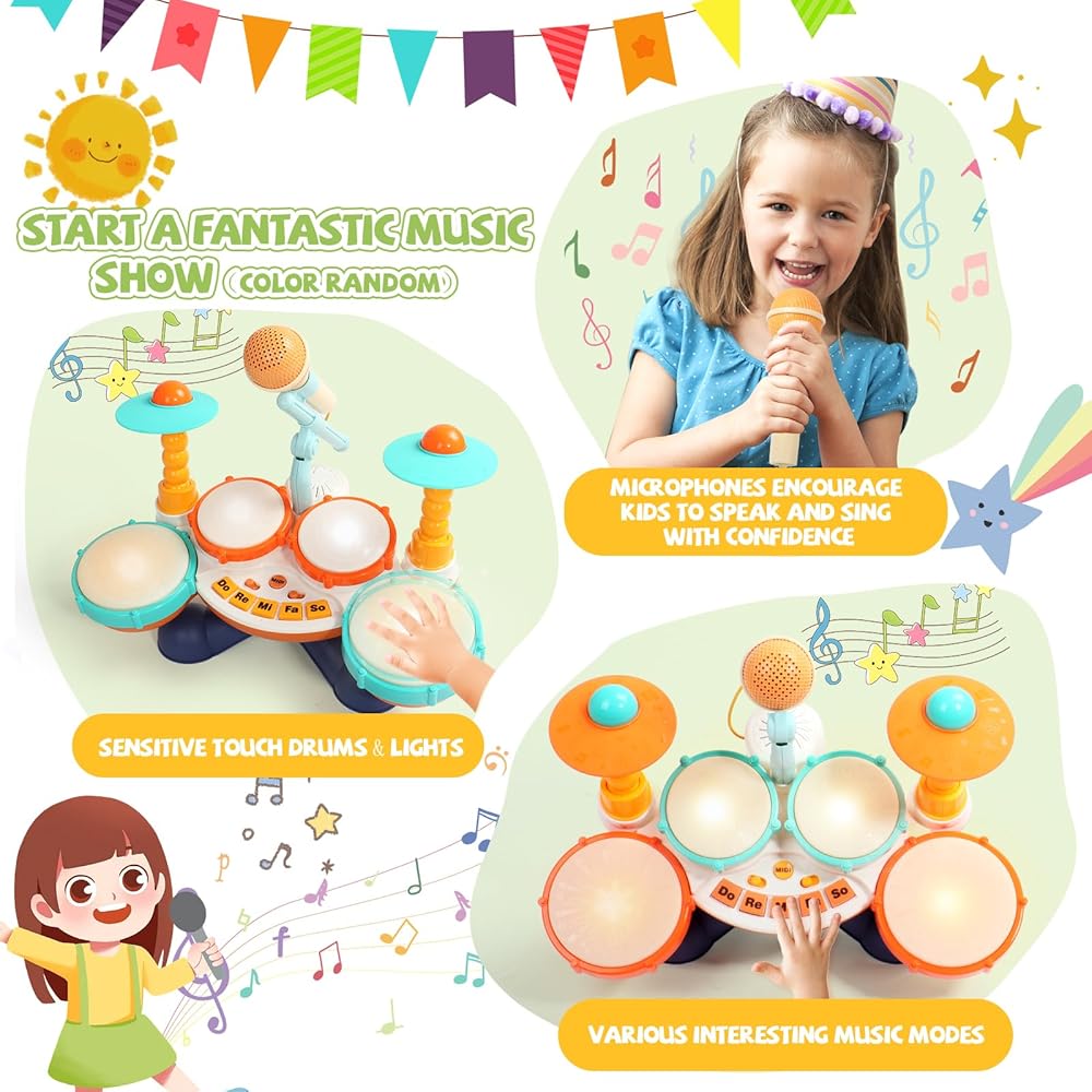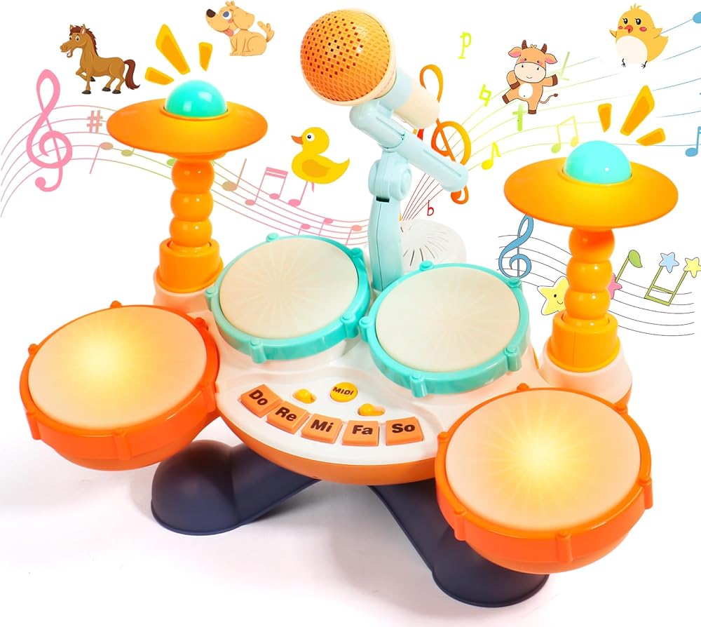 مجموعة طبول للأطفال مجموعة طبول للأطفال الصغار من 1 إلى 3 ألعاب موسيقية مع ميكروفون للأطفال الصغار ألعاب لعمر سنة واحدة للأولاد والبنات هدايا عيد الميلاد الأولى تضيء لعبة تعليمية للأعمار من 1 إلى 3 سنوات (لون عشوائي)