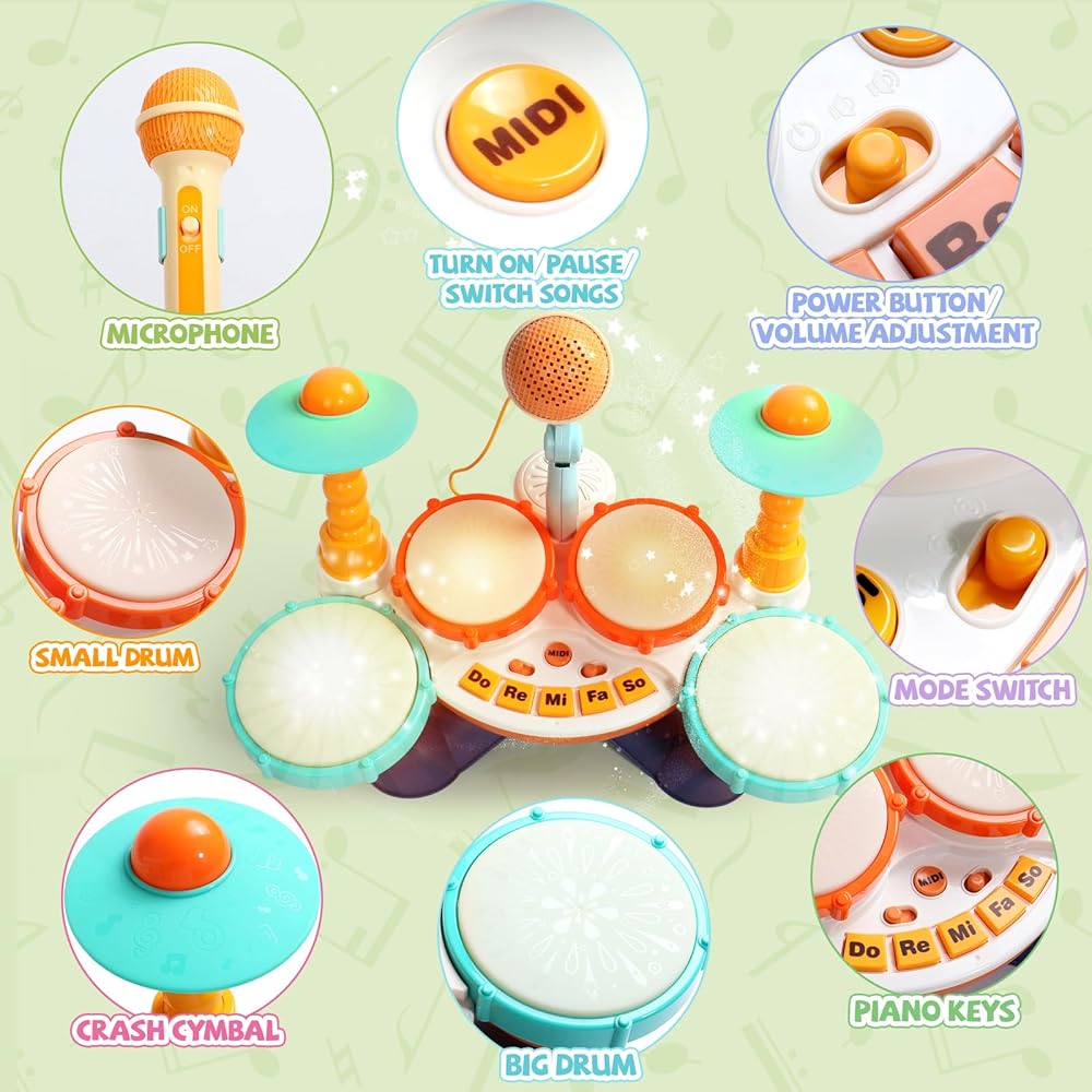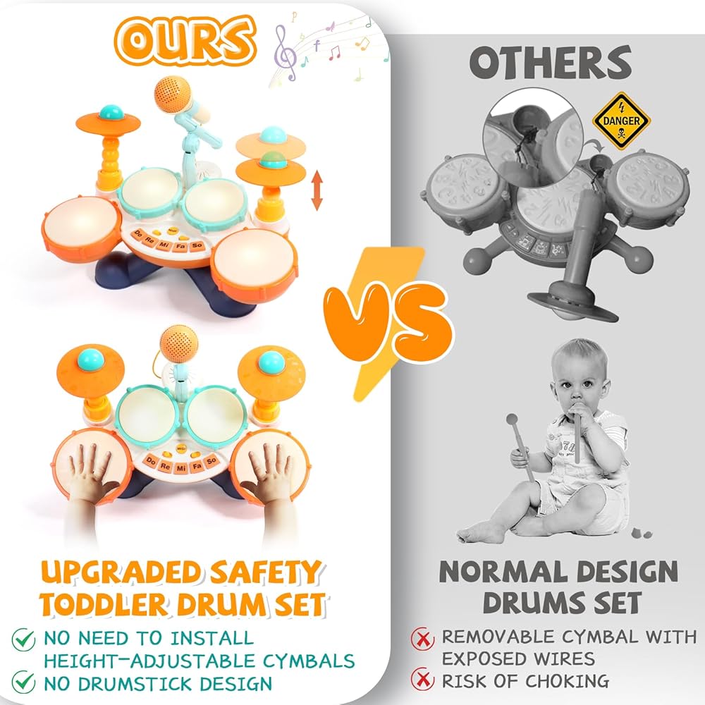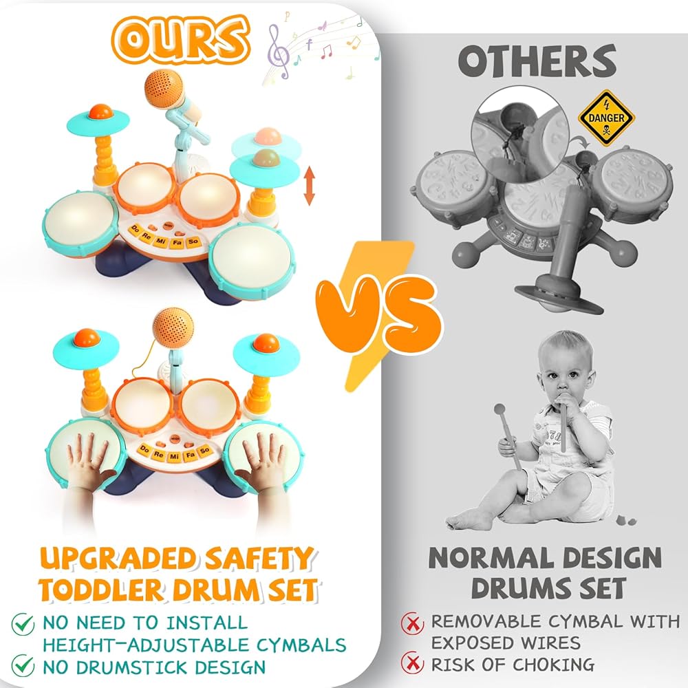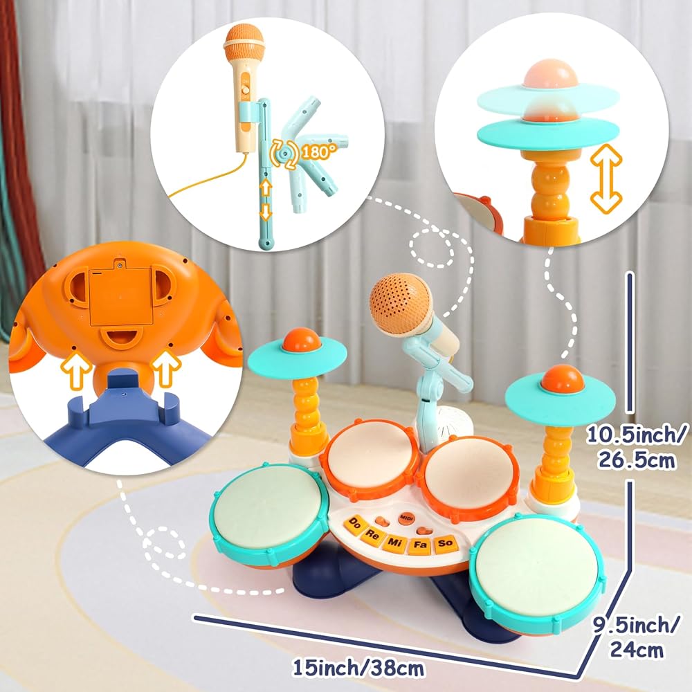🌟【مجموعة طبول أطفال مطورة مع ميكروفون】لقد قمنا ببعض التحسينات المذهلة:1. ترقية مفاتيح الطبلة الثلاثة إلى 4، وإزالة أعواد الطبل لمزيد من الأمان.2. 2 ارتفاع قابل للتعديل ولكن لا يتطلب التجميع مفاتيح الصنج مع عدم وجود خطر من الأسلاك المكشوفة.3. 1 ميكروفون قابل لتعديل الارتفاع. تعمل وظيفة تعديل الضوء والحجم الناعم على حماية بصر طفلك وسمعه، مما يمنح أطفالك المزيد من الفرص للإبداع والاستمتاع بتجربة موسيقية غامرة.