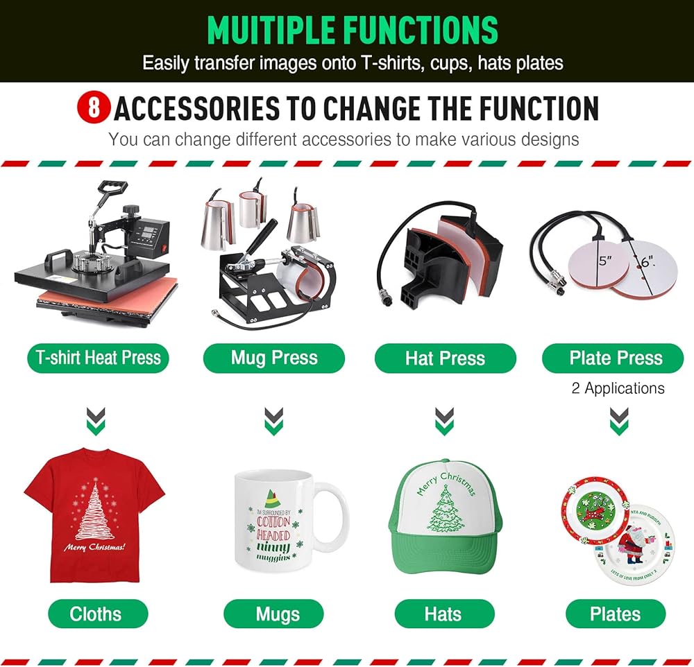✅ ماكينة ضغط حراري 15 × 15 بوصة 8 في 1 يمكن استخدامها للقمصان والقبعات وألواح السيراميك وبلاط السيراميك والأكواب والأكواب وسادات الماوس وألغاز الصور المقطوعة والحروف وغيرها من الأشياء المتنوعة. الأقمشة والمواد. يمكنه نقل الصور والأحرف الملونة لحبر الطباعة المتسامي والمذاب على السيراميك والنظارات والمنسوجات مثل القطن والكتان والألياف الكيماوية والنايلون وما إلى ذلك.