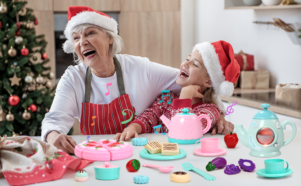 مجموعة ألعاب الشاي من كيوت ستون للفتيات الصغار، مجموعة حفلات الشاي للأطفال تتضمن غلاية مع ضوء وموسيقى، إبريق الشاي، الحلوى، الكوكيت، إكسسوارات حفلات الشاي وحقيبة حمل، لعبة المطبخ التظاهري للأطفال