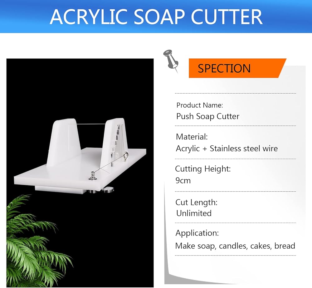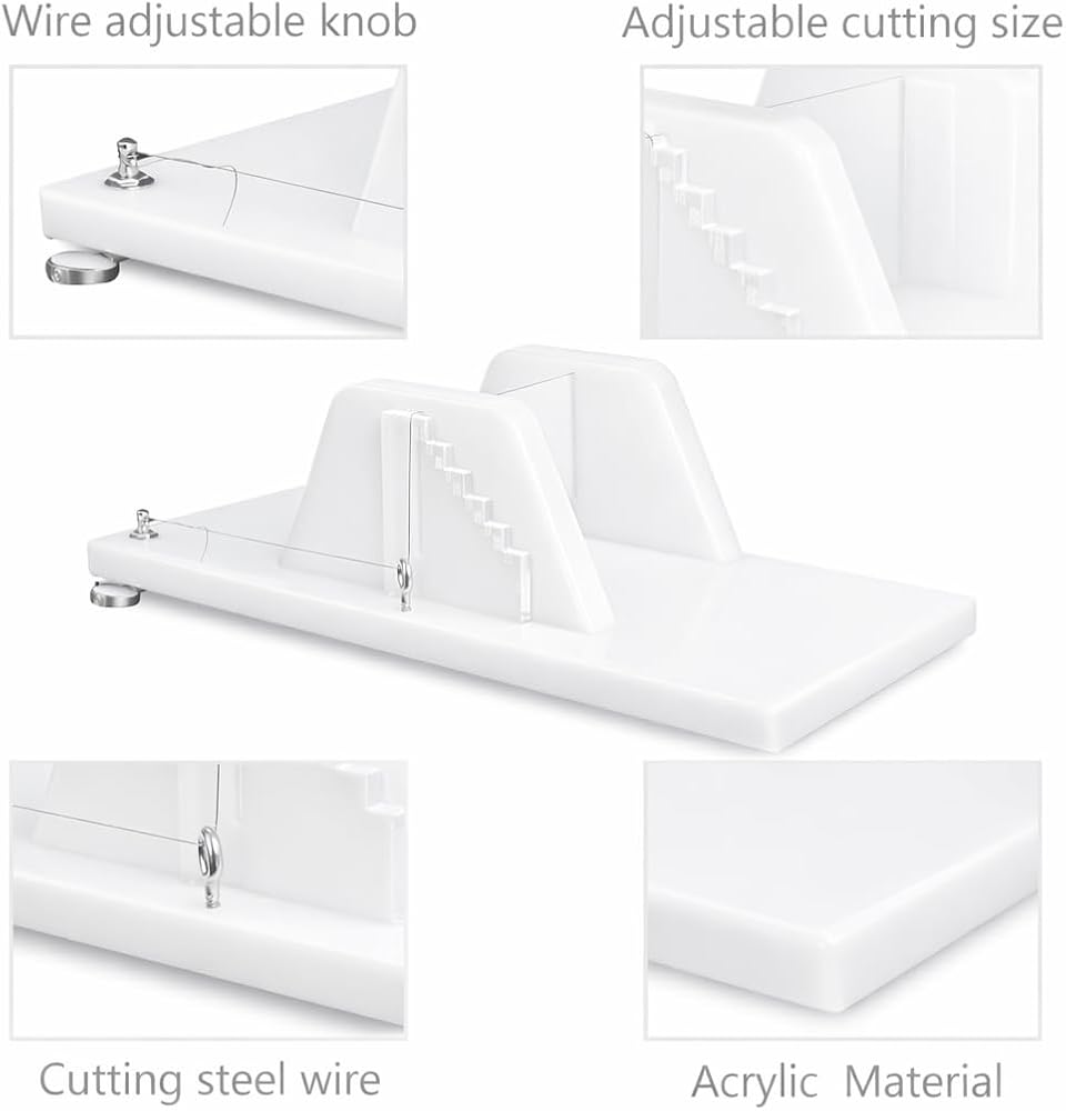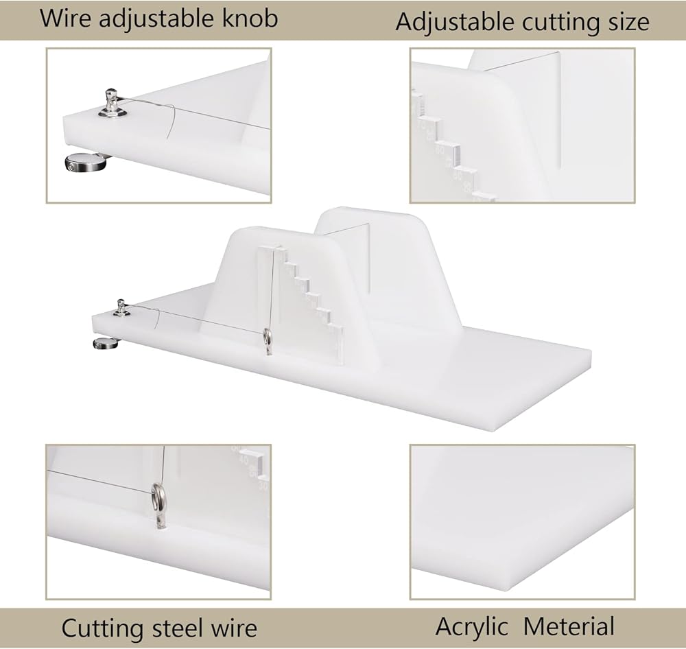 【مادة ممتازة】: قطاعة الصابون الرغيف مصنوعة من مادة أكريليك شفافة عالية الجودة، مع سلك من الفولاذ المقاوم للصدأ قابل للتعديل ولوح أكريليك بمقياس. مقاوم للخدش، ومقاوم للتآكل، وقوة عالية ولكنه خفيف.