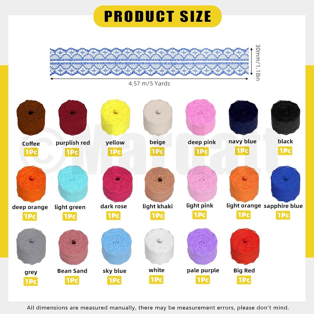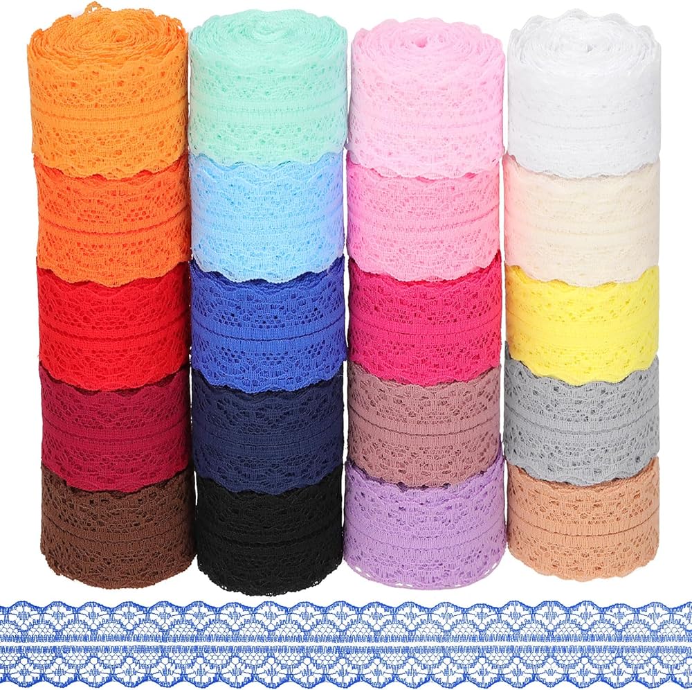Mardatt 15 لفة 165 ياردة شريط دانتيل، مجموعة شريط دانتيل من القماش بنمط الأزهار بعرض 1-3/4 بوصة، مجموعة شريط دانتيل من القماش بألوان مختلطة لتغليف الهدايا وديكورات الزفاف (15 لونًا)
